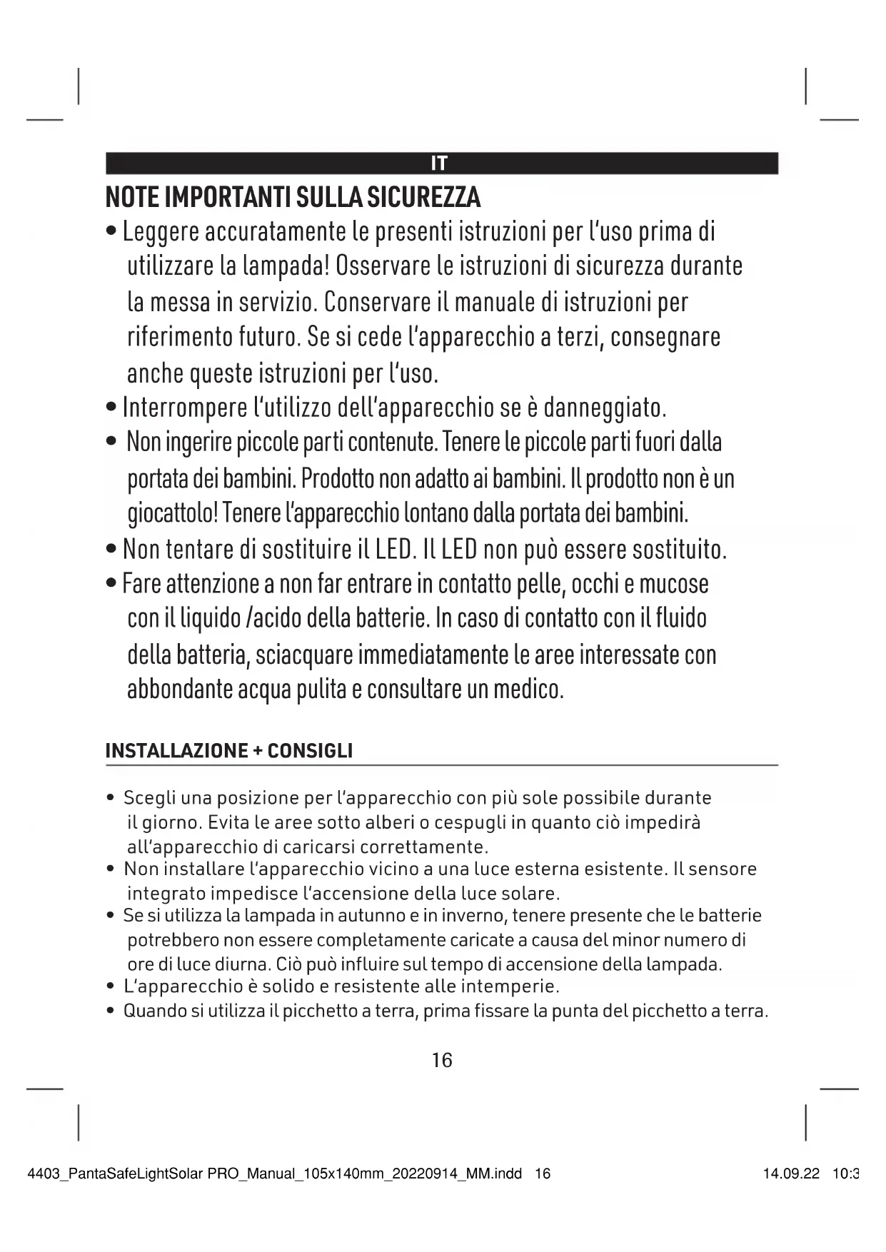 - La luce solare non si accende alla luce del giorno. La batteria verrà caricata durante questo periodo. M34403_PantaSafeLightSolar PRO_Manual_105x140mm_20220914_MM.indd 17M34403_PantaSafeLightSolar PRO_Manual_105x140mm_20220914_MM.indd 17 14.09.22 10:3514.09.22 10:3518