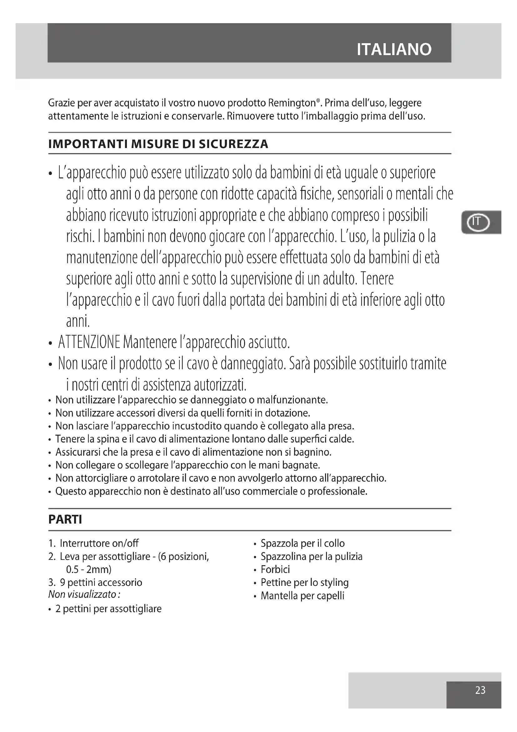 Per evitare problemi di salute ed ambientali dovuti a sostanze pericolose, gli apparecchi e le batterie ricaricabili e non ricaricabili contrassegnati con uno di questi simboli non devono essere smaltiti con i riuti urbani indierenziati. Smaltire i prodotti elettrici ed elettronici e, quando possibile, le batterie ricaricabili e non ricaricabili, in un punto di raccolta autorizzato per il riciclo/la raccolta. ITALIANO27 DANSK Tak for at have købt dit nye produkt fra Remington®. Læs venligst denne vejledning omhyggeligt før brug og bevar den godt. Fjern al emballage før brug. VIGTIGE SIKKERHEDSFORANSTALTNINGER