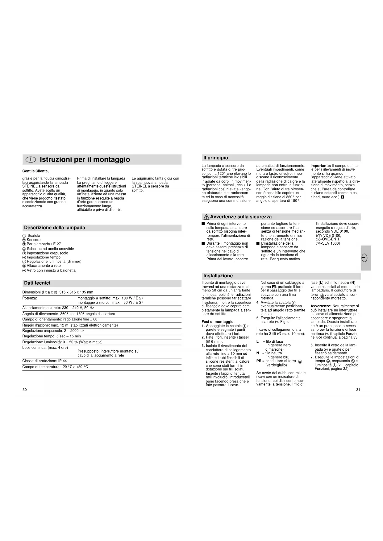 -SEV 1000) Dimensioni (l x a x p): 315 x 315 x 135 mm Potenza: montaggio a soffitto: max. 100 W / E 27 montaggio a muro: max. 60 W / E 27 Allacciamento alla rete: 230 – 240 V, 50 Hz Angolo di rilevamento: 360° con 180° angolo di apertura Campo di orientamento: regolazione fine ± 60° Raggio d'azione: max. 12 m (stabilizzati elettronicamente) Regolazione crepuscolo: 2 – 2000 lux Regolazione tempo: 5 sec – 15 min Regolazione luminosità: 0 – 50 % (Watt-o-matic) Luce continua: (max. 4 ore) Presupposto: interruttore montato sul cavo di allacciamento a rete Classe di protezione: IP 44 Campo di temperatura: -20 °C a +50 °C Istruzioni per il montaggio Gentile Cliente, grazie per la fiducia dimostra- taci acquistando la lampada STEINEL a sensore da soffitto. Avete scelto un apparecchio di alta qualità, che viene prodotto, testato e confezionato con grande accuratezza. Prima di installare la lampada La preghiamo di leggere attentamente queste istruzioni di montaggio, in quanto solo un'installazione ed una messa in funzione eseguite a regola d'arte garantiscono un funzionamento lungo, affidabile e privo di disturbi. Descrizione della lampada a. Scatola b Sensore c Portalampada / E 27 d Schermo ad anello amovible e Impostazione crepuscolo f Impostazione tempo g Regolazione luminosità (dimmer) h Allacciamento a rete i Vetro con innesto a baionetta Dati tecnici