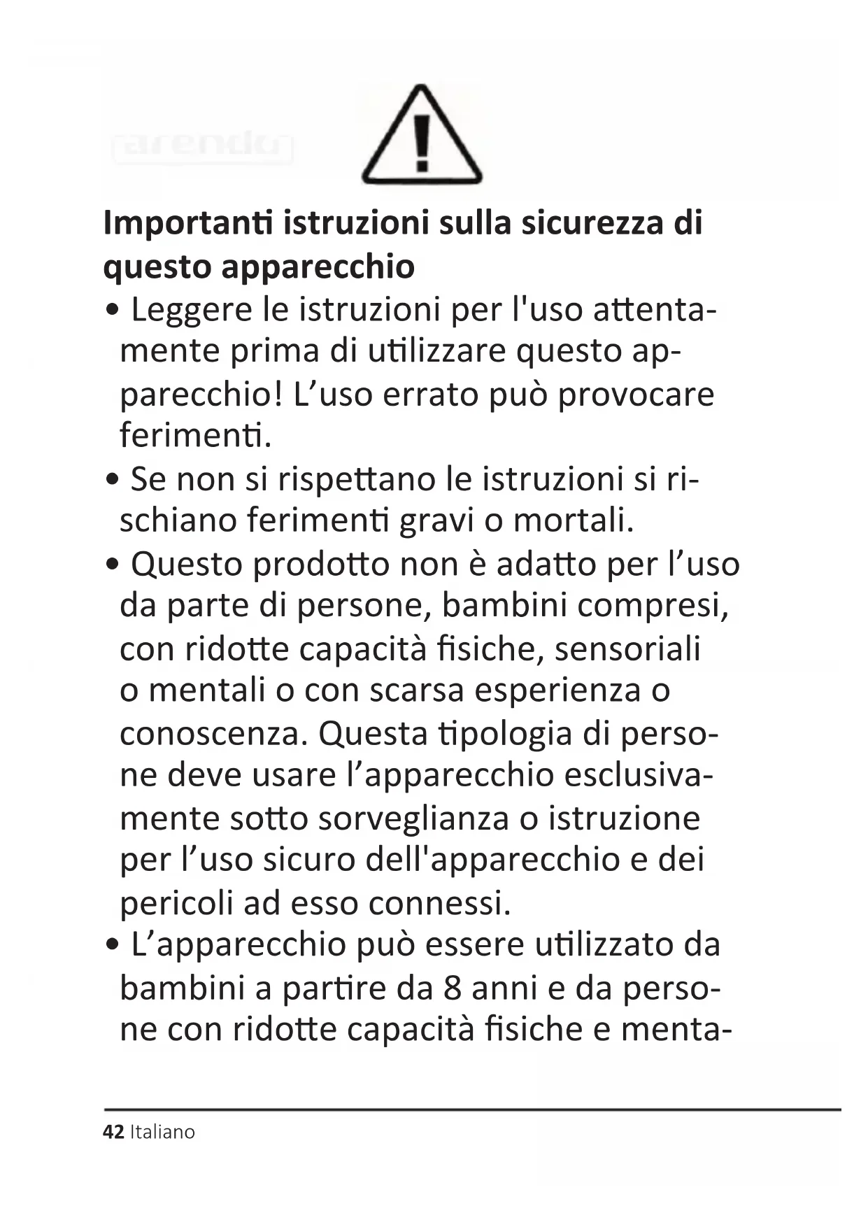 - L’apparecchio può essere ulizzato da bambini a parre da 8 anni e da perso- ne con ridoe capacità siche e menta-43Italiano li, se ques vengono istrui o controlla da una persona che è responsabile per la loro sicurezza.