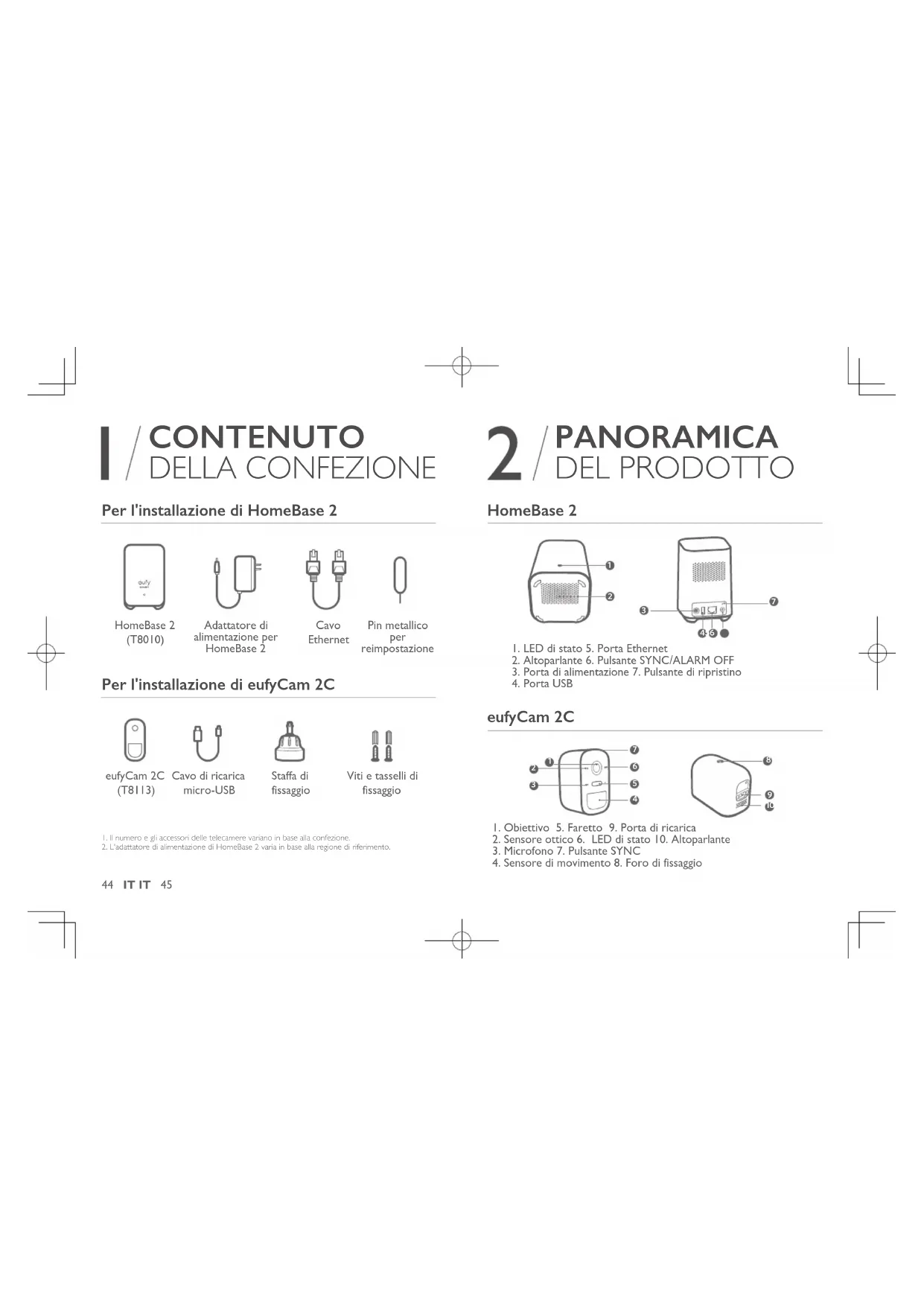 CONTENUTO DELLA CONFEZIONE Per l'installazione di HomeBase 2 HomeBase 2 (T8010) Adattatore di alimentazione per HomeBase 2 Cavo Ethernet Pin metallico per reimpostazione Per l'installazione di eufyCam 2C eufyCam 2C (T8113) Cavo di ricarica micro-USB Staffa di fissaggio Viti e tasselli di fissaggio
