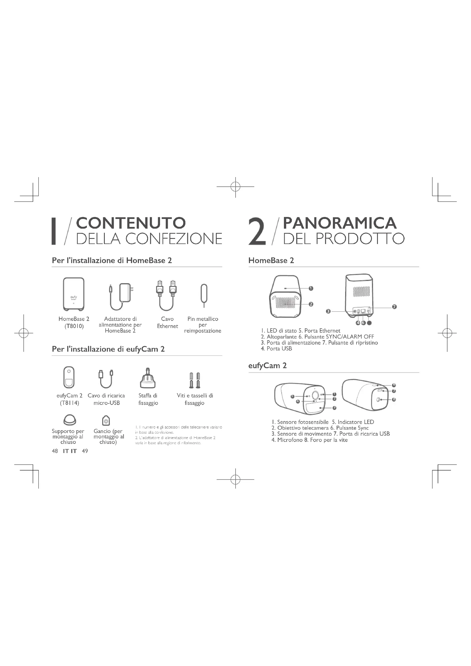 Ricarica di eufyCam 248 IT IT 49 CONTENUTO DELLA CONFEZIONE Per l'installazione di HomeBase 2 HomeBase 2 (T8010) Adattatore di alimentazione per HomeBase 2 Cavo Ethernet Pin metallico per reimpostazione Per l'installazione di eufyCam 2 eufyCam 2 (T8114) Cavo di ricarica micro-USB Staffa di fissaggio Viti e tasselli di fissaggio PANORAMICA DEL PRODOTTO HomeBase 2