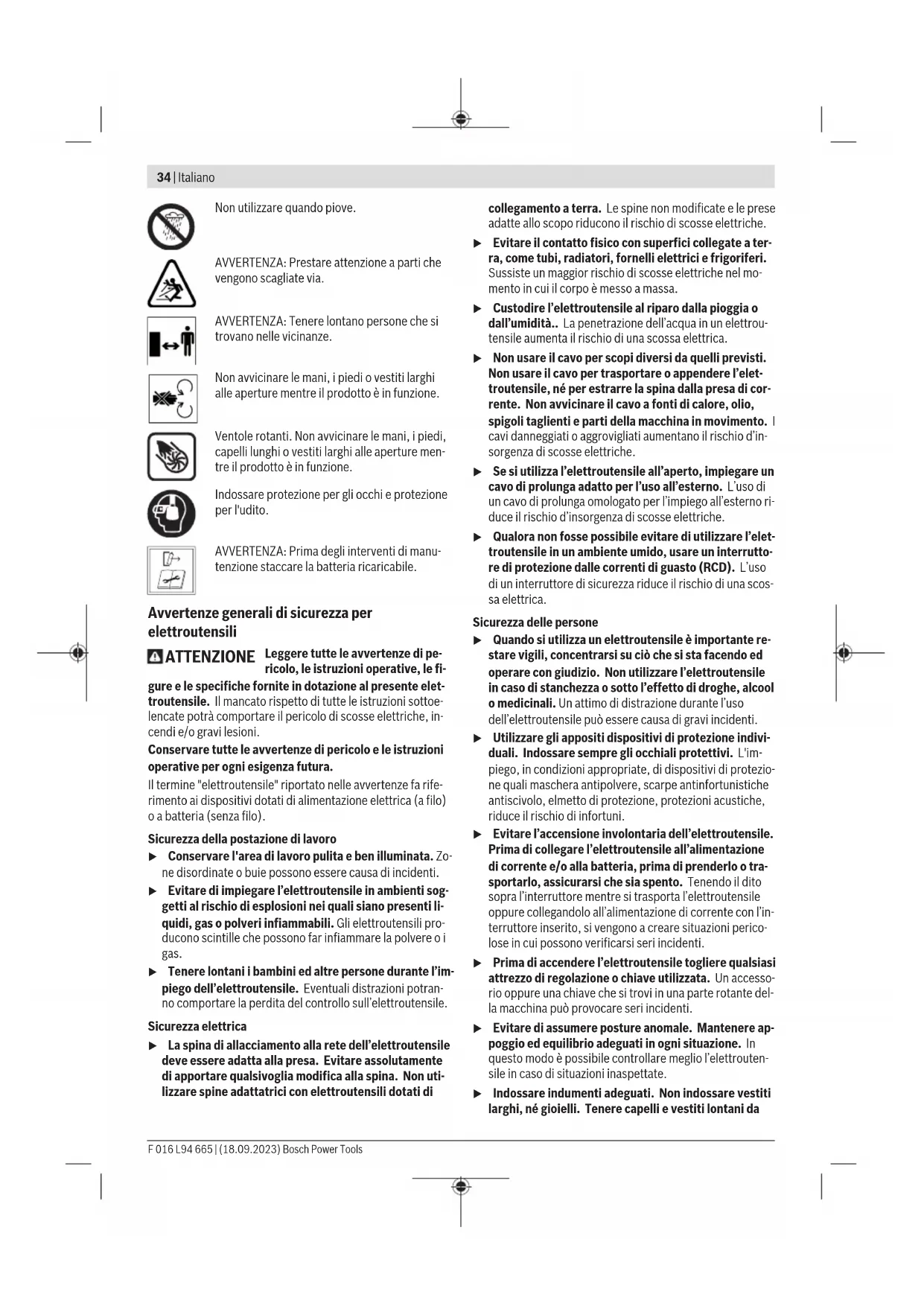 Símbolos Os símbolos a seguir são importantes para a leitura e para a compreensão destas instruções de serviço. Os símbolos e os seus significados devem ser memorizados. A interpretação correta dos símbolos ajuda a usar o produto de modo melhor e mais seguro. Símbolo Significado Direção do movimento Ligar Ligar Desligar CLICK! Nítido ruído Acessórios Busca de erros A tabela a seguir apresenta sintomas de erros e as respetivas soluções, caso a sua máquina não esteja a funcionar corretamente. Se não for possível localizar e eliminar o problema com estas informações, dirija‑se à sua oficina de serviço. Atenção: Desligar o aparelho antes solucionar problemas. Atenção: Em caso de acidente ou de ruptura da ferramenta, pare imediatamente a máquina e remova a bateria. Sintoma Possível causa Solução O aparelho de jardinagem não funciona Descarregar a bateria Carregar a bateria A bateria não foi introduzida de forma correta Inserção correta da bateria (veja figura C) Bateria fria/quente demais Permitir que a bateria se aqueça/arrefeça. Sempre ligue o produto com um número de rotações baixo Aparelho de jardinagem com defeito Dirija‑se a uma oficina de serviço pós-venda O aparelho de jardinagem funciona com interrupções Interruptor de ligar-desligar com defeito Dirija‑se a uma oficina de serviço pós-venda Regulador de velocidade do fluxo de ar com defeito Dirija‑se a uma oficina de serviço pós-venda Fortes vibrações/ ruídos Aparelho de jardinagem com defeito Dirija‑se a uma oficina de serviço pós-venda Período de trabalho, por carga da bateria, curto demais A bateria não foi utilizada por muito tempo ou só foi utilizada durante curto tempo Carregar totalmente a bateria Bateria quebrada ou com defeito Substituir a bateria A ferramenta de jardinagem não sopra Bocal bloqueado Liberar o bocal Fluxo de ar reduzido Entrada de ar bloqueada Limpar a entrada de ar Bateria demasiado fria Sempre ligue o produto com um número de rotações baixo F 016 L94 665 | (18.09.2023) Bosch Power ToolsItaliano | 33 Sintoma Possível causa Solução Não é possível montar o bocal Montagem incorreta Montagem correta do bocal (veja figura B) Manutenção e serviço Manutenção, limpeza e armazenamento u Os produtos devem ser reparados apenas por pessoal técnico qualificado e devem ser usadas somente peças de substituição originais. Desta forma é assegurado o funcionamento seguro. u Nunca tente reparar acumuladores danificados. A reparação de acumuladores deve ser realizada apenas pelo fabricante ou agentes de assistência autorizados. Manutenção, limpeza e armazenamento Antes de armazenar o produto, limpe-o com um pano. Ao limpar e montar o bocal, certifique-se de que o motor esteja desligado e a bateria desconectada. Nunca usar solventes. Nunca pulverizar o produto com água. Nunca mergulhar o produto em água. Serviço pós-venda e aconselhamento O serviço pós-venda responde às suas perguntas a respeito de serviços de reparação e de manutenção do seu produto, assim como das peças sobressalentes. Desenhos explodidos e informações acerca das peças sobressalentes também em: www.bosch-pt.com A nossa equipa de consultores Bosch esclarece com prazer todas as suas dúvidas a respeito dos nossos produtos e acessórios. Indique para todas as questões e encomendas de peças sobressalentes a referência de 10 dígitos de acordo com a placa de caraterísticas do produto. Portugal Robert Bosch LDA Avenida Infante D. Henrique Lotes 2E – 3E 1800 Lisboa Para efetuar o seu pedido online de peças entre na página www.ferramentasbosch.com. Tel.: 21 8500000 Fax: 21 8511096 Encontra outros endereços da assistência técnica em: www.bosch-pt.com/serviceaddresses Transporte As baterias de iões de lítio recomendadas estão sujeitas ao direito de materiais perigosos. As baterias podem ser transportadas na rua pelo utilizador, sem mais obrigações. Na expedição por terceiros (porex: transporte aéreo ou expedição), devem ser observadas as especiais exigências quanto à embalagem e à designação. Neste caso é necessário consultar um especialista de materiais perigosos ao preparar a peça a ser trabalhada. Só enviar baterias se a carcaça não estiver danificada. Colar contactos abertos e embalar a bateria de modo que não possa se movimentar dentro da embalagem. Por favor observe também eventuais diretivas nacionais suplementares. Eliminação Os aparelhos de jardinagem, os acessórios e as embalagens devem ser enviados a uma reciclagem ecológica de matéria-prima. Não deite os produtos e acumuladores/baterias no lixo doméstico! Apenas para países da UE: De acordo com a Diretiva Europeia 2012/19/EU, produtos que não são mais utilizáveis devem ser coletados e, de acordo com a Diretiva Europeia 2006/66/CE, acumuladores/baterias defeituosos ou usados devem ser coletados separadamente e reciclados de forma compatível com o meio ambiente. No caso de uma eliminação incorreta, os aparelhos elétricos e eletrónicos antigos podem ter efeitos nocivos no ambiente e na saúda humada devido à possível presença de substâncias perigosas. Baterias/pilhas: Lítio: Observar as indicações no capítulo Transporte (ver "Transporte", Página33). Italiano Indicazioni di sicurezza Spiegazione dei simboli presenti sull'apparecchio per il giardinaggio Allarme generale di pericolo. Leggere le istruzioni d’uso. Bosch Power Tools F 016 L94 665 | (18.09.2023)34 | Italiano Non utilizzare quando piove. AVVERTENZA: Prestare attenzione a parti che vengono scagliate via. AVVERTENZA: Tenere lontano persone che si trovano nelle vicinanze. Non avvicinare le mani, i piedi o vestiti larghi alle aperture mentre il prodotto è in funzione. Ventole rotanti. Non avvicinare le mani, i piedi, capelli lunghi o vestiti larghi alle aperture men- tre il prodotto è in funzione. Indossare protezione per gli occhi e protezione per l'udito. AVVERTENZA: Prima degli inte