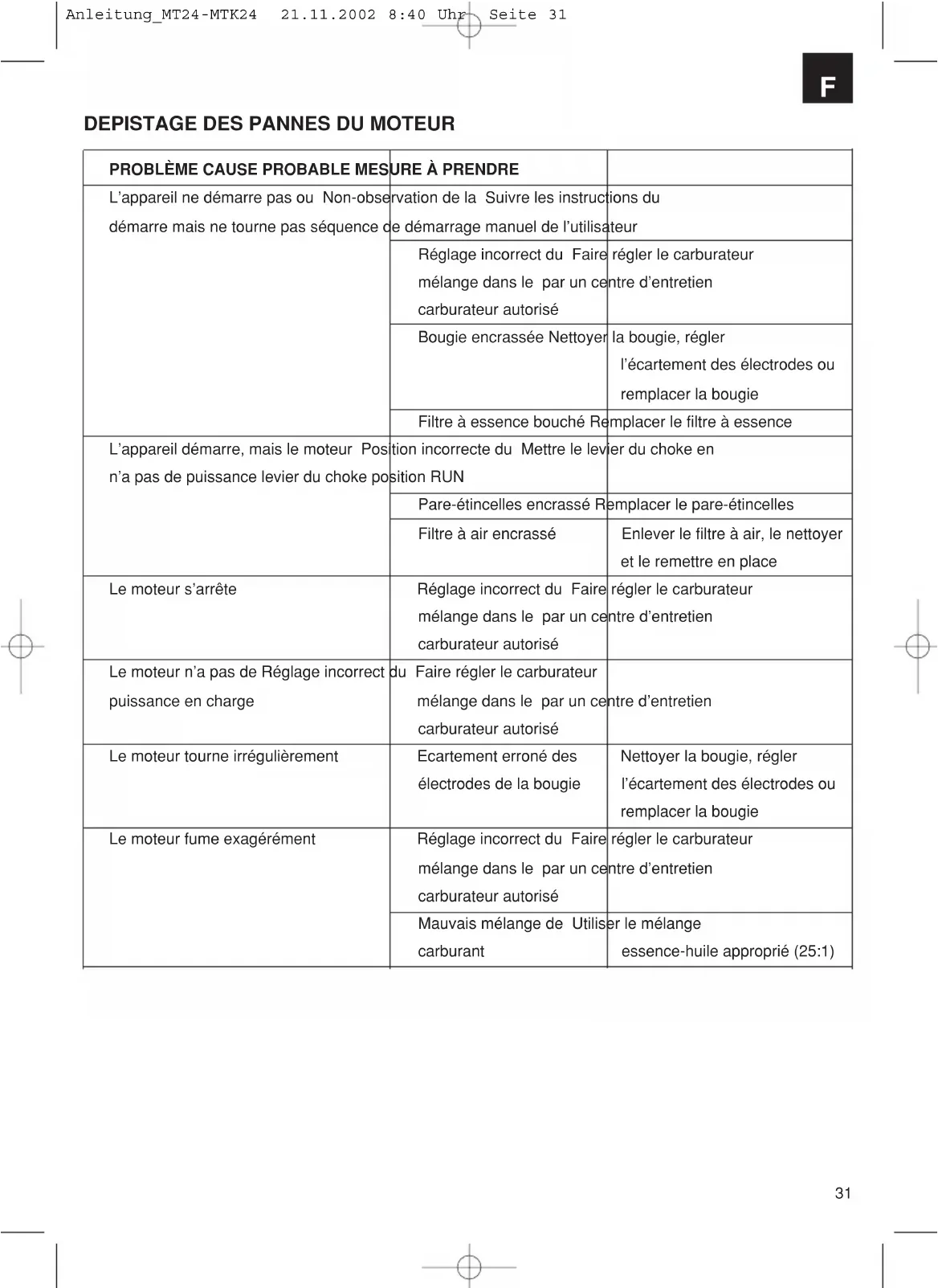 L’apparecchio non si avvia Procedura di avviamento sbagliata. Seguire le indicazioni fornite oppure si avvia ma non funziona. nelle Istruzioni per l’uso. Regolazione sbagliata della miscela Fare regolare il carburatore nel carburatore. da un centro di assistenza autorizzato. Candela sporca Pulire la candela, correggere la distanza tra gli elettrodi o sostituire la candela. Filtro del carburante intasato Sostituire il filtro del carburante. L’apparecchio si avvia ma il Regolazione sbagliata della l Mettere la leva in motore non ha sufficiente potenza. evetta dell’aria. posizione RUN. Parascintille sporco Sostituire il parascintille. Filtro dell’aria sporco Estrarre il filtro, pulirlo e rimetterlo in posizione. Regolazione sbagliata della Fare regolare il carburatore da miscela nel carburatore. un centro di assistenza autorizzato. Il motore si ferma. Regolazione sbagliata della Fare regolare il carburatore miscela nel carburatore. da un centro di assistenza autorizzato. Il motore non ha spinta durante il funzionamento. Il motore funziona in modo Distanza sbagliata tra gli Pulire la candela, correggere irregolare. elettrodi sulla candela. la distanza tra gli elettrodi o sostituire la candela. Il motore fuma in modo eccessivo. Regolazione sbagliata della Fare regolare il carburatore da miscela nel carburatore. un centro di assistenza autorizzato. Miscela di carburante sbagliata. Utilizzare la miscela di carburante corretta (proporzione 25:1). Anleitung_MT24-MTK24 21.11.2002 8:41 Uhr Seite 4041 EC ∆λωση περι της ανταπκρισης Dichiarazione di conformità CE EC Overensstemmelseserklæring EU prohlášení o konformitě EU Konformkijelentés EU Izjava o skladnosti Oświadczenie o zgodności z normami Europejskiej Wspólnoty Vyhásenie EU o konformite EG Konformitätserklärung EC Declaration of Conformity Déclaration de Conformité CE EC Conformiteitsverklaring Declaracion CE de Conformidad Declaração de conformidade CE EC Konformitetsförklaring EC Yhdenmukaisuusilmoitus EC Konfirmitetserklæring EC Заявление о конформности Dichiarazione di conformità CE Declaraţie de conformitate CE AT Uygunluk Deklarasyonu