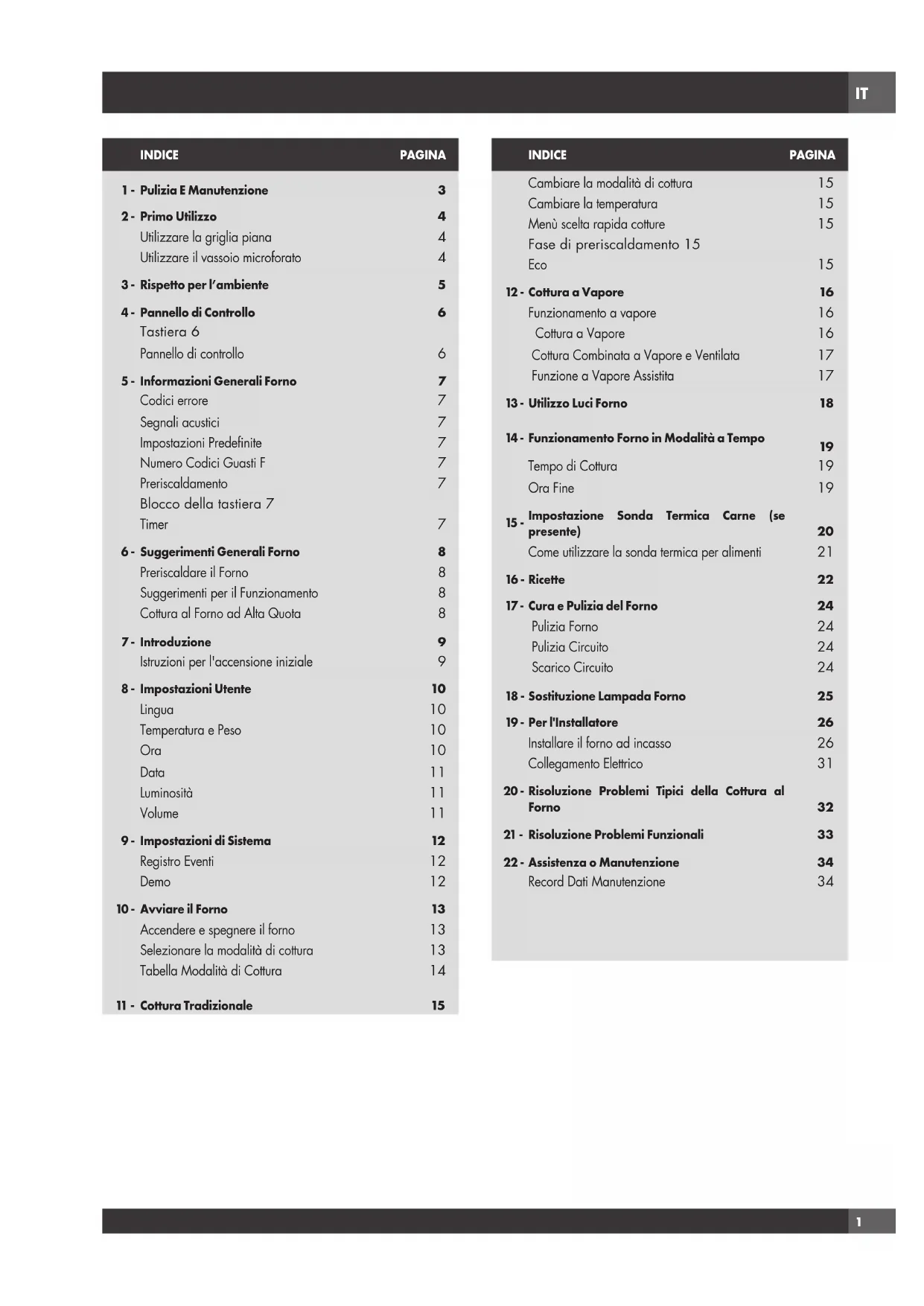 NOTA È fondamentale leggere attentamente le istruzioni e le avvertenze per un corretto utilizzo. Funzionamento a vapore La cottura a vapore viene utilizzata nella maggior parte delle cucine orientali, ma è sicuramente molto utilizzata anche nella nostra. É priva di grassi e presenta il vantaggio di preservare il sapore originale degli alimenti. In questo caso, il cibo non è cotto con acqua, ma con vapore acqueo. La cottura a vapore è differente dalla bollitura. In effetti, il vapore acqueo lavora sull'interno delle cellule, che è fondamentalmente diverso dall'effetto dell'acqua bollente. Di fatto, anche il vapore cucina completamente, ma nulla fuoriesce dall'alimento se non il grasso. Le pareti cellulari si ammorbidiscono gradualmente, le proteine si coagulano senza fuoriuscire, Gli amidi si rigonfiano e si combinano e gli zuccheri e i minerali rimangono inalterati. Lo stesso vale anche per gli odori che sono ridotti al minimo, o per le sostanze colorate. Solamente i liquidi si liquefanno a causa del calore e, per tale ragione, non è mai una buona idea cuocere al vapore grandi pezzi di carne o pesce. Le vitamine sono un'altra storia in quanto il calore tende generalmente a distruggerle; tuttavia, in base al tempo di cottura, alcune di esse vengono solo leggermente alterate. Quindi gli alimenti che si prestano a questa metodologia di cottura sono , in generale, quelli senza grassi quali, ad esempio, pesce, alcuni tipi di carne, legumi, patate, cereali, uova, budini, verdure, ecc. Non è consigliabile per verdure con fibre dure o per frutta in generale. Consigli utili Quando si utilizza il forno a vapore, iniziare sempre a forno freddo. Utilizzare il vapore in un forno caldo (immediatamente dopo la cottura tradizionale) non è raccomandato in quanto i benefici della cottura a vapore possono essere neutralizzati. Per la cottura a vapore, provare ad utilizzare più possibile vassoi microforati di acciaio inossidabile insieme ai loro vassoi di raccolta liquidi anch'essi di acciaio inossidabile Il primo, che poggia sul suo supporto sulla griglia piana, permette di cuocere completamente al vapore il cibo mentre tutto ciò che fuoriesce dal cibo durante la cottura scola attraverso i fori. Il secondo vassoio più in basso, scorre sotto la griglia sulle sue guide, raccoglie la scolatura e mantiene l'interno del forno più pulito. Finito di cucinare, il supporto del vassoio microforato può essere utilizzato come supporto per tenere il vassoio caldo lontano dal mobile mentre rimuovete il cibo che avete appena cucinato. ATTENZIONE Prima di utilizzare qualunque funzione a vapore, il contenitore dell'acqua deve essere riempito. Se mentre il forno è acceso, compare sul display il messaggio CONTROLLARE IL CONTENITORE DELL'ACQUA (segnale acustico sonoro), aprire la porta, fare attenzione al vapore caldo che potrebbe fuoriuscire, estrarre il contenitore e riempirlo. Quando la porta è chiusa, il forno va in modalità PAUSA. Premere il tasto per continuare. NOTA: Le funzioni a vapore non inizieranno finché la porta non sarà chiusa. Se la porta è aperta, sul display verrà mostrato il messaggio CHIUDERE LA PORTA. Se la porta è aperta mentre il forno è acceso, il forno andrà in modalità pausa. Per riavviare la funzione, la porta deve essere chiusa. Selezionare la funzione desiderata e confermare utilizzando il tasto , a questo punto il circuito verrà riempito. Non appena l'acqua raggiunge la giusta temperatura, il vapore generato dal boiler entrerà nel vano cottura. La funzione può essere messa in pausa in qualsiasi momento utilizzando il tasto , quando viene premuto nuovamente la funzione si riavvia.