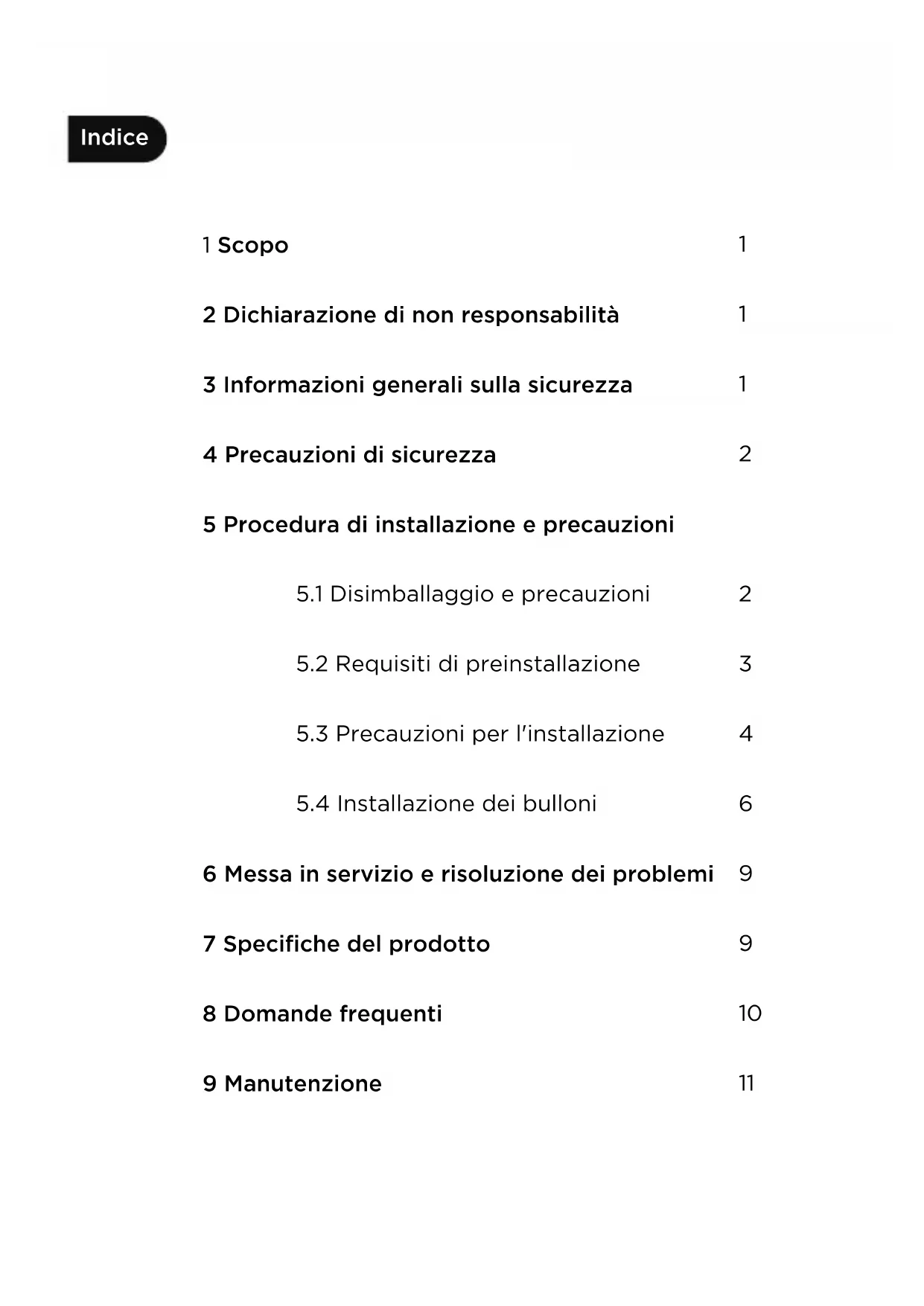 6 Messa in servizio e risoluzione dei problemi 7 Specifiche del prodotto 8 Domande frequenti 9 Manutenzione