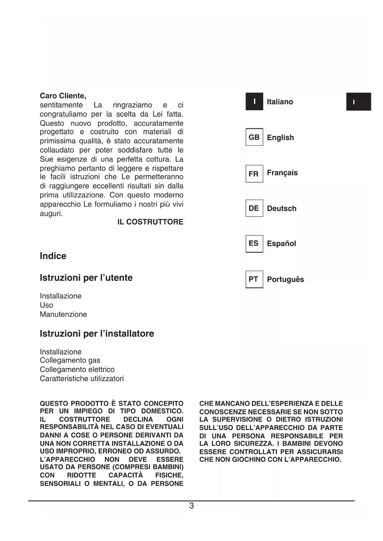 CHE NON GIOCHINO CON L’APPARECCHIO. Caro Cliente, sentitamente La ringraziamo e ci congratuliamo per la scelta da Lei fatta. Questo nuovo prodotto, accuratamente progettato e costruito con materiali di primissima qualità, è stato accuratamente collaudato per poter soddisfare tutte le Sue esigenze di una perfetta cottura. La preghiamo pertanto di leggere e rispettare le facili istruzioni che Le permetteranno di raggiungere eccellenti risultati sin dalla prima utilizzazione. Con questo moderno apparecchio Le formuliamo i nostri più vivi auguri. IL COSTRUTTORE