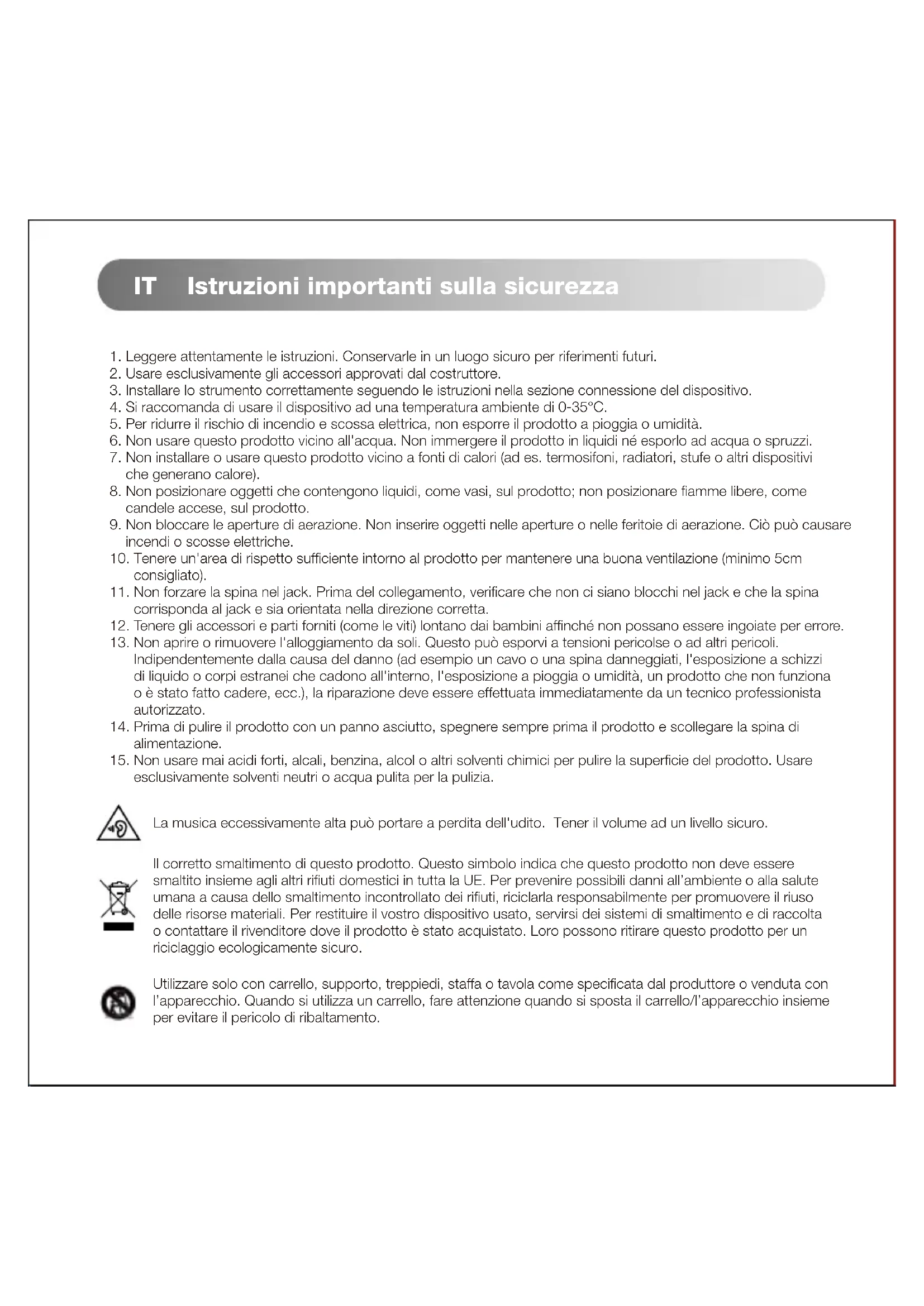 alimentazione. 15. Non usare mai acidi forti, alcali, benzina, alcol o altri solventi chimici per pulire la superficie del prodotto. Usare esclusivamente solventi neutri o acqua pulita per la pulizia. La musica eccessivamente alta può portare a perdita dell'udito. Tener il volume ad un livello sicuro. Il corretto smaltimento di questo prodotto. Questo simbolo indica che questo prodotto non deve essere smaltito insieme agli altri rifiuti domestici in tutta la UE. Per prevenire possibili danni all’ambiente o alla salute umana a causa dello smaltimento incontrollato dei rifiuti, riciclarla responsabilmente per promuovere il riuso delle risorse materiali. Per restituire il vostro dispositivo usato, servirsi dei sistemi di smaltimento e di raccolta o contattare il rivenditore dove il prodotto è stato acquistato. Loro possono ritirare questo prodotto per un riciclaggio ecologicamente sicuro. Utilizzare solo con carrello, supporto, treppiedi, staffa o tavola come specificata dal produttore o venduta con l’apparecchio. Quando si utilizza un carrello, fare attenzione quando si sposta il carrello/l’apparecchio insieme per evitare il pericolo di ribaltamento.Istruzioni importanti sulla sicurezza Questo simbolo indica che si tratta di un prodotto di CLASSE II o di un dispositivo elettrico a doppio isolamento che non necessita di messa a terra. Questo simbolo indica che il prodotto è destinato esclusivamente all'uso in ambienti interni. Avvertenza sull'alimentazione: