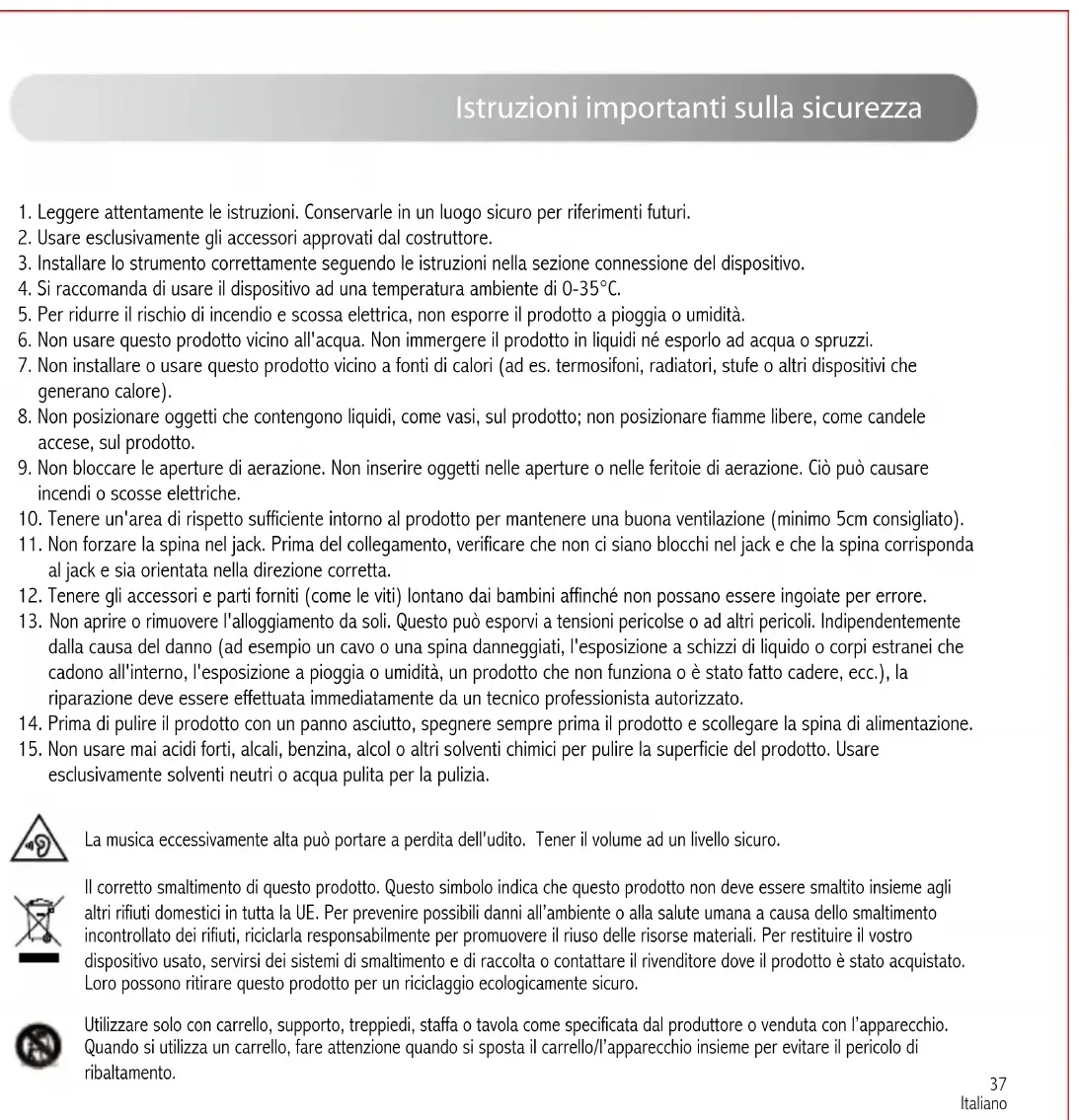 Non aprire o rimuovere l'alloggiamento da soli. Questo può esporvi a tensioni pericolse o ad altri pericoli. Indipendentemente dalla causa del danno (ad esempio un cavo o una spina danneggiati, l'esposizione a schizzi di liquido o corpi estranei che cadono all'interno, l'esposizione a pioggia o umidità, un prodotto che non funziona o è stato fatto cadere, ecc.), la riparazione deve essere effettuata immediatamente da un tecnico professionista autorizzato. 14. Prima di pulire il prodotto con un panno asciutto, spegnere sempre prima il prodotto e scollegare la spina di alimentazione. 15. Non usare mai acidi forti, alcali, benzina, alcol o altri solventi chimici per pulire la superficie del prodotto. Usare esclusivamente solventi neutri o acqua pulita per la pulizia.38 Italiano Questo simbolo avverte l'utente della presenza di tensioni pericolose non isolate all'interno dell'involucro del prodotto che potrebbero essere di grandezza sufficiente da costituire un pericolo di scosse elettriche per le persone. Questo simbolo avverte l'utente di non smontare l'involucro del prodotto e che non vi sono parti sostituibili dall'utente all'interno. Portare il prodotto presso un centro di assistenza autorizzato per la riparazione. Questo simbolo indica che il prodotto è destinato esclusivamente all'uso in ambienti interni. Questo simbolo indica che si tratta di un prodotto di CLASSE II o di un dispositivo elettrico a doppio isolamento che non necessita di messa a terra. Avvertenza sull'alimentazione: