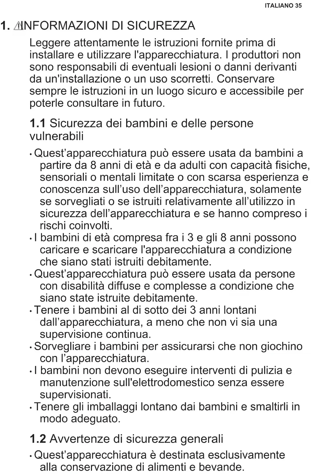 - I bambini di età compresa fra i 3 e gli 8 anni possono caricare e scaricare l'apparecchiatura a condizione che siano stati istruiti debitamente.