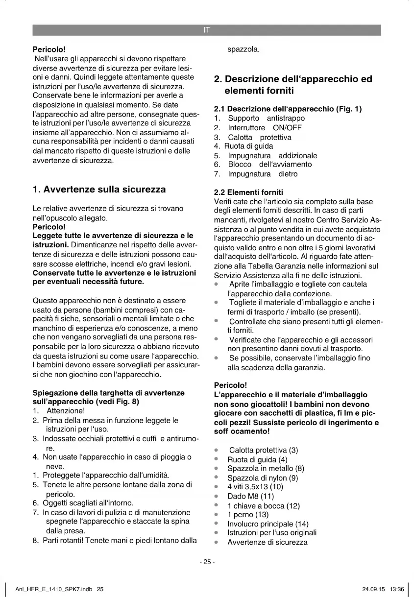 Prima di inserire la spina nella presa di corrente assicuratevi che i dati sulla targhetta di identifi ca- zione corrispondano a quelli di rete. Avvertenza! Staccate sempre la spina di alimentazione prima di ogni impostazione all’utensile. Anl_HFR_E_1410_SPK7.indb 26Anl_HFR_E_1410_SPK7.indb 26 24.09.15 13:3624.09.15 13:36IT