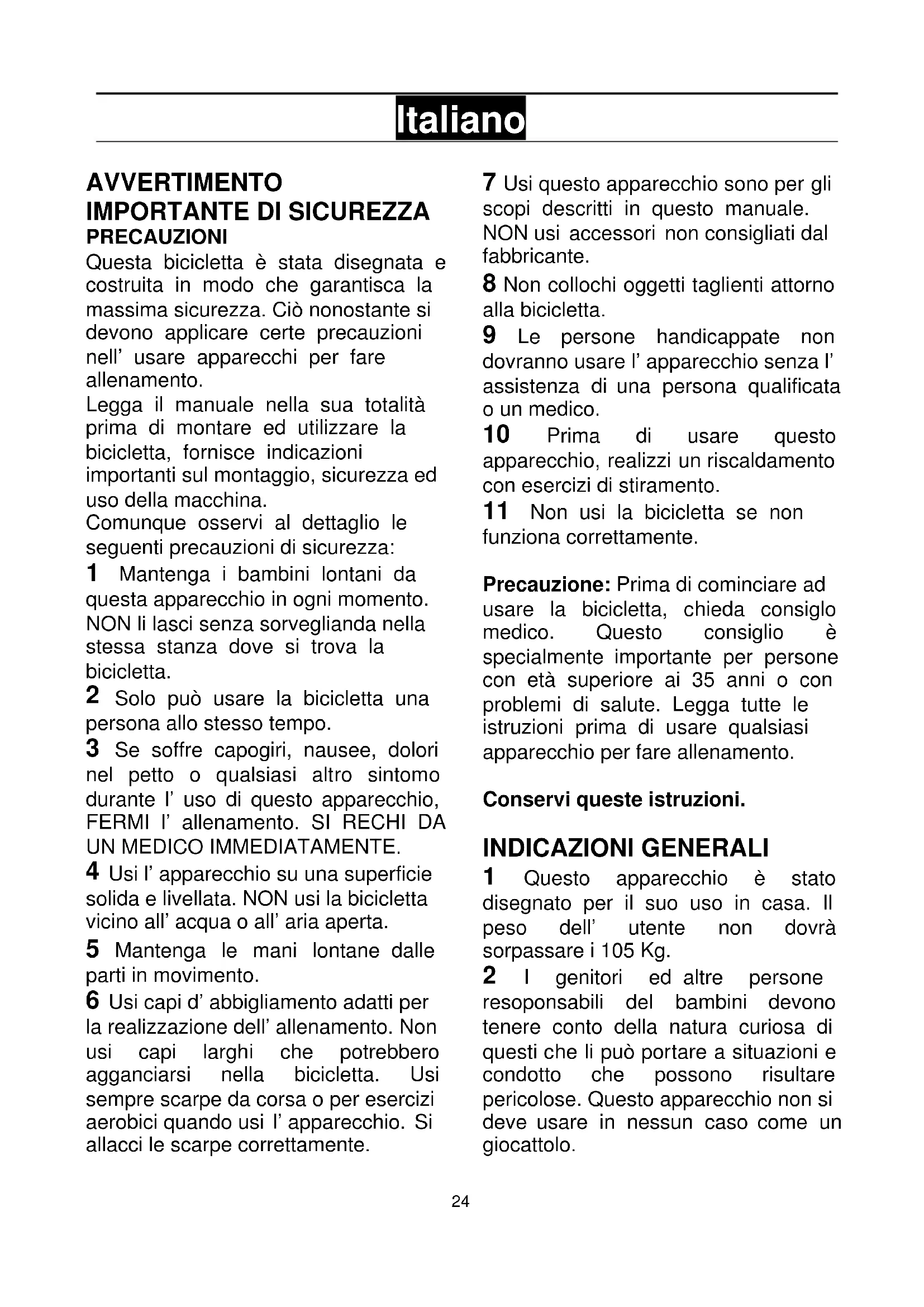 Non usi la bicicletta se non funziona correttamente. Precauzione: Prima di cominciare ad usare la bicicletta, chieda consiglo medico. Questo consiglio è specialmente importante per persone con età superiore ai 35 anni o con problemi di salute. Legga tutte le istruzioni prima di usare qualsiasi apparecchio per fare allenamento. Conservi queste istruzioni. INDICAZIONI GENERALI