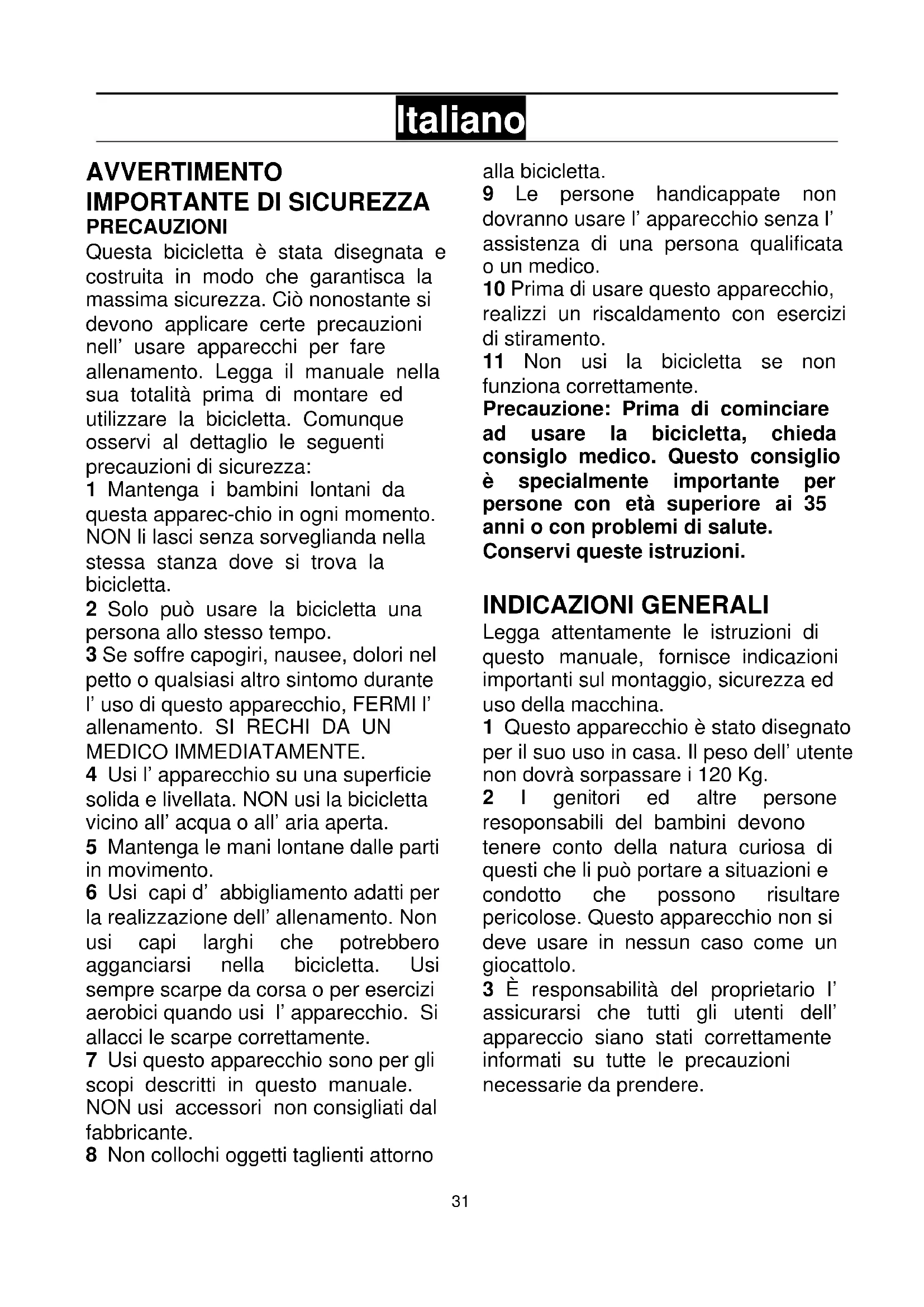 PRECAUZIONI Questa bicicletta è stata disegnata e costruita in modo che garantisca la massima sicurezza. Ciò nonostante si devono applicare certe precauzioni nell’ usare apparecchi per fare allenamento. Legga il manuale nella sua totalità prima di montare ed utilizzare la bicicletta. Comunque osservi al dettaglio le seguenti precauzioni di sicurezza: 1 Mantenga i bambini lontani da questa apparec-chio in ogni momento. NON li lasci senza sorveglianda nella stessa stanza dove si trova la bicicletta. 2 Solo può usare la bicicletta una persona allo stesso tempo. 3 Se soffre capogiri, nausee, dolori nel petto o qualsiasi altro sintomo durante l’ uso di questo apparecchio, FERMI l’ allenamento. SI RECHI DA UN MEDICO IMMEDIATAMENTE. 4 Usi l’ apparecchio su una superficie solida e livellata. NON usi la bicicletta vicino all’ acqua o all’ aria aperta. 5 Mantenga le mani lontane dalle parti in movimento. 6 Usi capi d’ abbigliamento adatti per la realizzazione dell’ allenamento. Non usi capi larghi che potrebbero agganciarsi nella bicicletta. Usi sempre scarpe da corsa o per esercizi aerobici quando usi l’ apparecchio. Si allacci le scarpe correttamente. 7 Usi questo apparecchio sono per gli scopi descritti in questo manuale. NON usi accessori non consigliati dal fabbricante. 8 Non collochi oggetti taglienti attorno alla bicicletta. 9 Le persone handicappate non dovranno usare l’ apparecchio senza l’ assistenza di una persona qualificata o un medico. 10 Prima di usare questo apparecchio, realizzi un riscaldamento con esercizi di stiramento. 11 Non usi la bicicletta se non funziona correttamente. Precauzione: Prima di cominciare ad usare la bicicletta, chieda consiglo medico. Questo consiglio è specialmente importante per persone con età superiore ai 35 anni o con problemi di salute. Conservi queste istruzioni. INDICAZIONI GENERALI Legga attentamente le istruzioni di questo manuale, fornisce indicazioni importanti sul montaggio, sicurezza ed uso della macchina. 1 Questo apparecchio è stato disegnato per il suo uso in casa. Il peso dell’ utente non dovrà sorpassare i 120 Kg. 2 I genitori ed altre persone resoponsabili del bambini devono tenere conto della natura curiosa di questi che li può portare a situazioni e condotto che possono risultare pericolose. Questo apparecchio non si deve usare in nessun caso come un giocattolo. 3 È responsabilità del proprietario l’ assicurarsi che tutti gli utenti dell’ appareccio siano stati correttamente informati su tutte le precauzioni necessarie da prendere.32