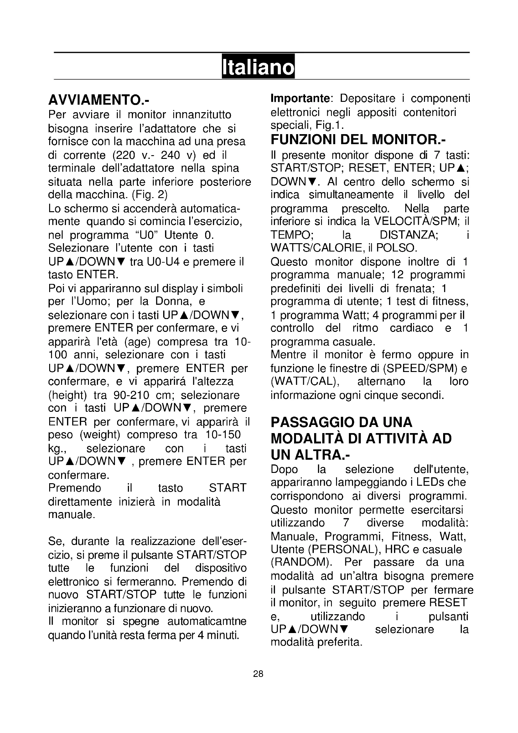 Italiano AVVIAMENTO.- Per avviare il monitor innanzitutto bisogna inserire l’adattatore che si fornisce con la macchina ad una presa di corrente (220 v.- 240 v) ed il terminale dell’adattatore nella spina situata nella parte inferiore posteriore della macchina. (Fig. 2) Lo schermo si accenderà automatica- mente quando si comincia l’esercizio, nel programma “U0” Utente 0. Selezionare l’utente con i tasti UP▲/DOWN▼ tra U0-U4 e premere il tasto ENTER. Poi vi appariranno sul display i simboli per l’Uomo; per la Donna, e selezionare con i tasti UP▲/DOWN▼, premere ENTER per confermare, e vi apparirà l'età (age) compresa tra 10- 100 anni, selezionare con i tasti UP▲/DOWN▼, premere ENTER per confermare, e vi apparirá l'altezza (height) tra 90-210 cm; selezionare con i tasti UP▲/DOWN▼, premere ENTER per confermare, vi apparirà il peso (weight) compreso tra 10-150 kg., selezionare con i tasti UP▲/DOWN▼ , premere ENTER per confermare. Premendo il tasto START direttamente inizierà in modalità manuale. Se, durante la realizzazione dell’eser- cizio, si preme il pulsante START/STOP tutte le funzioni del dispositivo elettronico si fermeranno. Premendo di nuovo START/STOP tutte le funzioni inizieranno a funzionare di nuovo. Il monitor si spegne automaticamtne quando l’unità resta ferma per 4 minuti. Importante: Depositare i componenti elettronici negli appositi contenitori speciali, Fig.1.