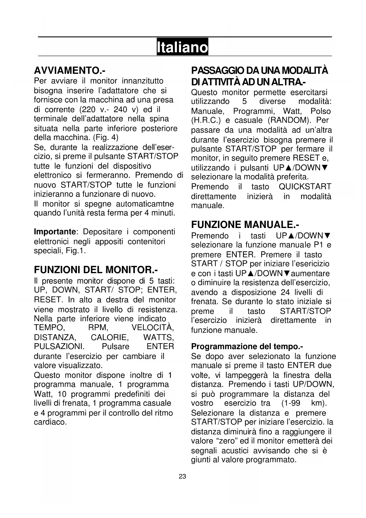 Italiano AVVIAMENTO.- Per avviare il monitor innanzitutto bisogna inserire l’adattatore che si fornisce con la macchina ad una presa di corrente (220 v.- 240 v) ed il terminale dell’adattatore nella spina situata nella parte inferiore posteriore della macchina. (Fig. 4) Se, durante la realizzazione dell’eser- cizio, si preme il pulsante START/STOP tutte le funzioni del dispositivo elettronico si fermeranno. Premendo di nuovo START/STOP tutte le funzioni inizieranno a funzionare di nuovo. Il monitor si spegne automaticamtne quando l’unità resta ferma per 4 minuti. Importante: Depositare i componenti elettronici negli appositi contenitori speciali, Fig.1.