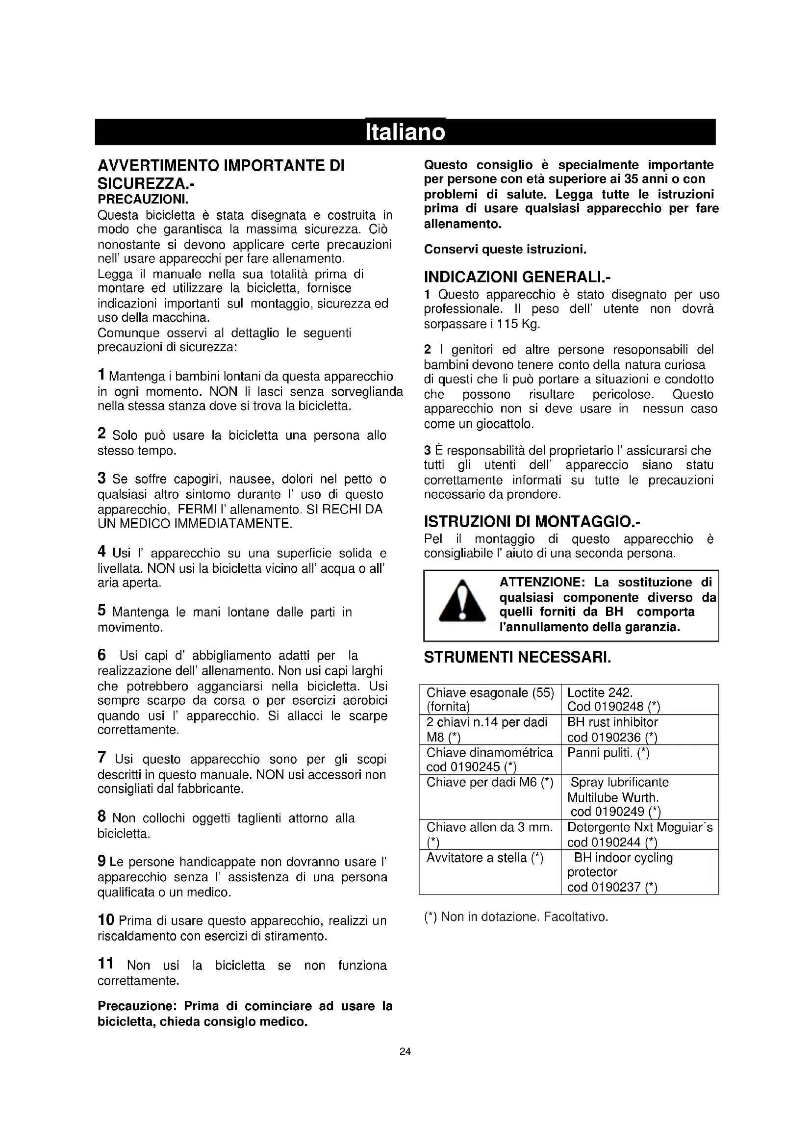 Pel il montaggio di questo apparecchio è consigliabile l' aiuto di una seconda persona. ATTENZIONE: La sostituzione di qualsiasi componente diverso da quelli forniti da BH comporta l'annullamento della garanzia. STRUMENTI NECESSARI. Chiave esagonale (55) (fornita) Loctite 242. Cod 0190248 (*) 2 chiavi n.14 per dadi M8 (*) BH rust inhibitor cod 0190236 (*) Chiave dinamométrica cod 0190245 (*) Panni puliti. (*) Chiave per dadi M6 (*) Spray lubrificante Multilube Wurth. cod 0190249 (*) Chiave allen da 3 mm.