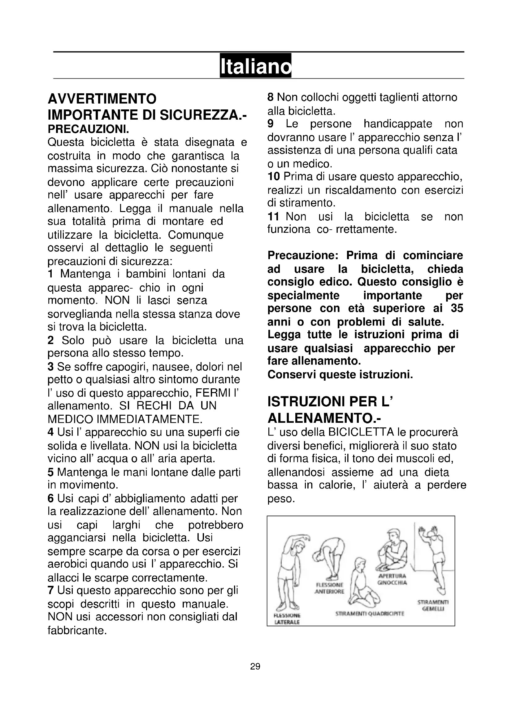 PRECAUZIONI. Questa bicicletta è stata disegnata e costruita in modo che garantisca la massima sicurezza. Ciò nonostante si devono applicare certe precauzioni nell’ usare apparecchi per fare allenamento. Legga il manuale nella sua totalità prima di montare ed utilizzare la bicicletta. Comunque osservi al dettaglio le seguenti precauzioni di sicurezza: 1 Mantenga i bambini lontani da questa apparec- chio in ogni momento. NON li lasci senza sorveglianda nella stessa stanza dove si trova la bicicletta. 2 Solo può usare la bicicletta una persona allo stesso tempo. 3 Se soffre capogiri, nausee, dolori nel petto o qualsiasi altro sintomo durante l’ uso di questo apparecchio, FERMI l’ allenamento. SI RECHI DA UN MEDICO IMMEDIATAMENTE. 4 Usi l’ apparecchio su una superfi cie solida e livellata. NON usi la bicicletta vicino all’ acqua o all’ aria aperta. 5 Mantenga le mani lontane dalle parti in movimento. 6 Usi capi d’ abbigliamento adatti per la realizzazione dell’ allenamento. Non usi capi larghi che potrebbero agganciarsi nella bicicletta. Usi sempre scarpe da corsa o per esercizi aerobici quando usi l’ apparecchio. Si allacci le scarpe correctamente. 7 Usi questo apparecchio sono per gli scopi descritti in questo manuale. NON usi accessori non consigliati dal fabbricante. 8 Non collochi oggetti taglienti attorno alla bicicletta. 9 Le persone handicappate non dovranno usare l’ apparecchio senza l’ assistenza di una persona qualifi cata o un medico. 10 Prima di usare questo apparecchio, realizzi un riscaldamento con esercizi di stiramento. 11 Non usi la bicicletta se non funziona co- rrettamente. Precauzione: Prima di cominciare ad usare la bicicletta, chieda consiglo edico. Questo consiglio è specialmente importante per persone con età superiore ai 35 anni o con problemi di salute. Legga tutte le istruzioni prima di usare qualsiasi apparecchio per fare allenamento. Conservi queste istruzioni.