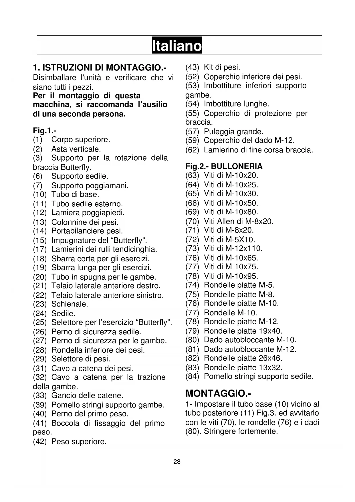 Disimballare l'unità e verificare che vi siano tutti i pezzi. Per il montaggio di questa macchina, si raccomanda l’ausilio di una seconda persona. Fig.1.- (1) Corpo superiore. (2) Asta verticale. (3) Supporto per la rotazione della braccia Butterfly. (6) Supporto sedile. (7) Supporto poggiamani. (10) Tubo di base. (11) Tubo sedile esterno. (12) Lamiera poggiapiedi. (13) Colonnine dei pesi. (14) Portabilanciere pesi. (15) Impugnature del “Butterfly”. (17) Lamierini dei rulli tendicinghia. (18) Sbarra corta per gli esercizi. (19) Sbarra lunga per gli esercizi. (20) Tubo in spugna per le gambe. (21) Telaio laterale anteriore destro. (22) Telaio laterale anteriore sinistro. (23) Schienale. (24) Sedile. (25) Selettore per l’esercizio “Butterfly”. (26) Perno di sicurezza sedile. (27) Perno di sicurezza per le gambe. (28) Rondella inferiore dei pesi. (29) Selettore di pesi. (31) Cavo a catena dei pesi. (32) Cavo a catena per la trazione della gambe. (33) Gancio delle catene. (39) Pomello stringi supporto gambe. (40) Perno del primo peso. (41) Boccola di fissaggio del primo peso. (42) Peso superiore. (43) Kit di pesi. (52) Coperchio inferiore dei pesi. (53) Imbottiture inferiori supporto gambe. (54) Imbottiture lunghe. (55) Coperchio di protezione per braccia. (57) Puleggia grande. (59) Coperchio del dado M-12. (62) Lamierino di fine corsa braccia. Fig.2.- BULLONERIA (63) Viti di M-10x20. (64) Viti di M-10x25. (65) Viti di M-10x30. (66) Viti di M-10x50. (69) Viti di M-10x80. (70) Viti Allen di M-8x20. (71) Viti di M-8x20. (72) Viti di M-5X10. (73) Viti di M-12x110. (76) Viti di M-10x65. (77) Viti di M-10x75. (78) Viti di M-10x95. (74) Rondelle piatte M-5. (75) Rondelle piatte M-8. (76) Rondelle piatte M-10. (77) Rondelle M-10. (78) Rondelle piatte M-12. (79) Rondelle piatte 19x40. (80) Dado autobloccante M-10. (81) Dado autobloccante M-12. (82) Rondelle piatte 26x46. (83) Rondelle piatte 13x32. (84) Pomello stringi supporto sedile. MONTAGGIO.-