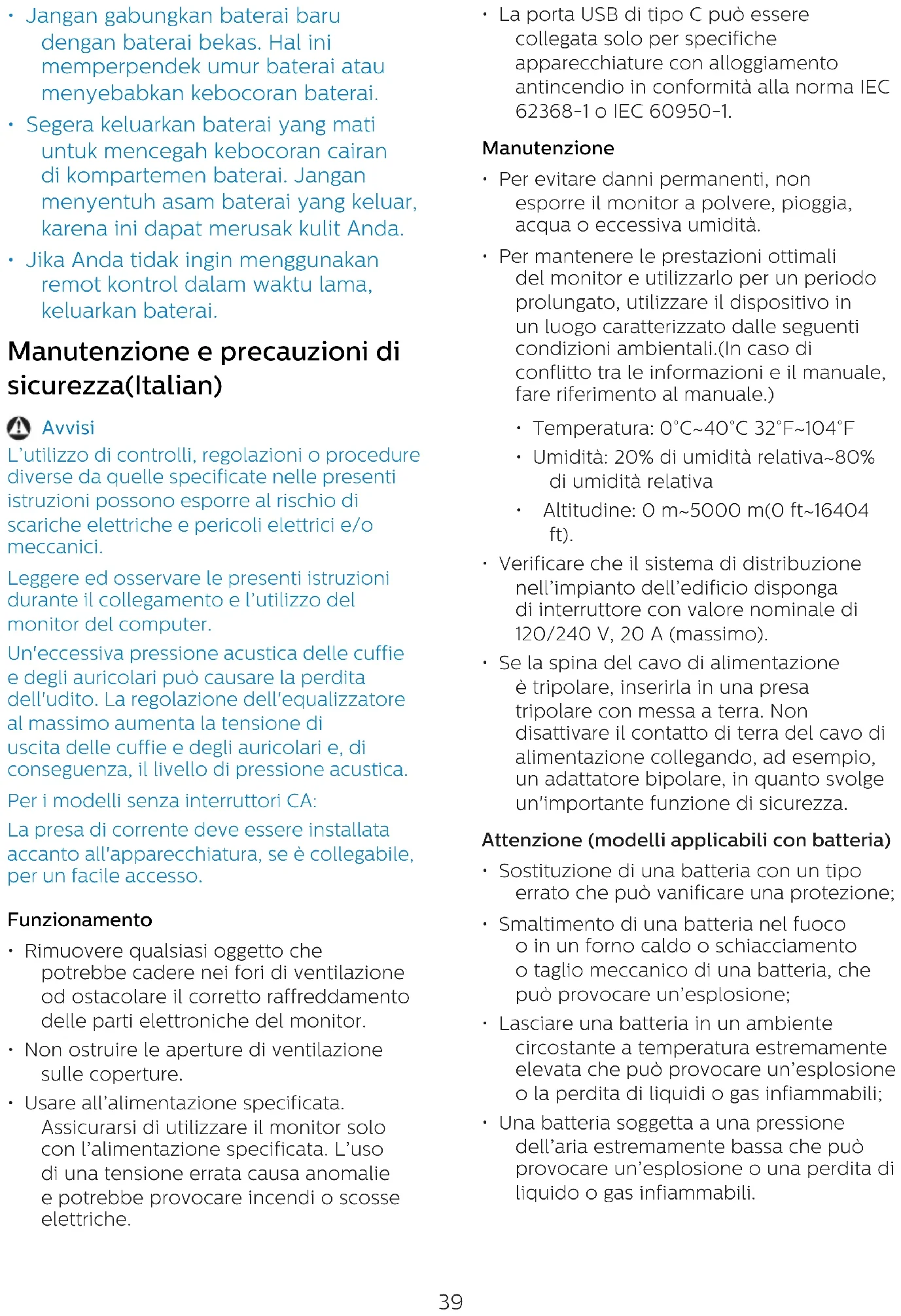 - Jika Anda tidak ingin menggunakan remot kontrol dalam waktu lama, keluarkan baterai. Manutenzione e precauzioni di sicurezza(Italian) Avvisi L’utilizzo di controlli, regolazioni o procedure diverse da quelle specificate nelle presenti istruzioni possono esporre al rischio di scariche elettriche e pericoli elettrici e/o meccanici. Leggere ed osservare le presenti istruzioni durante il collegamento e l’utilizzo del monitor del computer. Un'eccessiva pressione acustica delle cuffie e degli auricolari può causare la perdita dell'udito. La regolazione dell'equalizzatore al massimo aumenta la tensione di uscita delle cuffie e degli auricolari e, di conseguenza, il livello di pressione acustica. Per i modelli senza interruttori CA: La presa di corrente deve essere installata accanto all'apparecchiatura, se è collegabile, per un facile accesso. Funzionamento