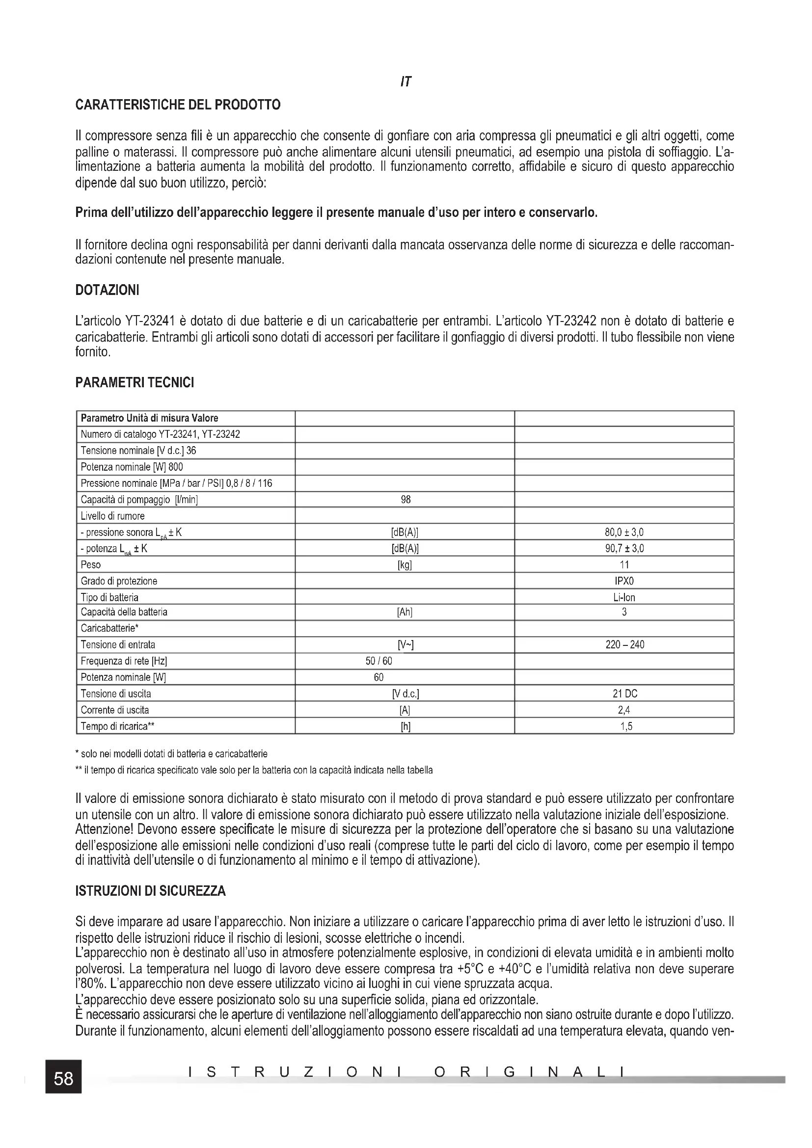 Il compressore senza fi li è un apparecchio che consente di gonfi are con aria compressa gli pneumatici e gli altri oggetti, come palline o materassi. Il compressore può anche alimentare alcuni utensili pneumatici, ad esempio una pistola di soffi aggio. L’a- limentazione a batteria aumenta la mobilità del prodotto. Il funzionamento corretto, affi dabile e sicuro di questo apparecchio dipende dal suo buon utilizzo, perciò: Prima dell’utilizzo dell’apparecchio leggere il presente manuale d’uso per intero e conservarlo. Il fornitore declina ogni responsabilità per danni derivanti dalla mancata osservanza delle norme di sicurezza e delle raccoman- dazioni contenute nel presente manuale. DOTAZIONI L’articolo YT-23241 è dotato di due batterie e di un caricabatterie per entrambi. L’articolo YT-23242 non è dotato di batterie e caricabatterie. Entrambi gli articoli sono dotati di accessori per facilitare il gonfi aggio di diversi prodotti. Il tubo fl essibile non viene fornito. PARAMETRI TECNICI Parametro Unità di misura Valore Numero di catalogo YT-23241, YT-23242 Tensione nominale [V d.c.] 36 Potenza nominale [W] 800 Pressione nominale [MPa / bar / PSI] 0,8 / 8 / 116 Capacità di pompaggio [l/min] 98 Livello di rumore - pressione sonora L
