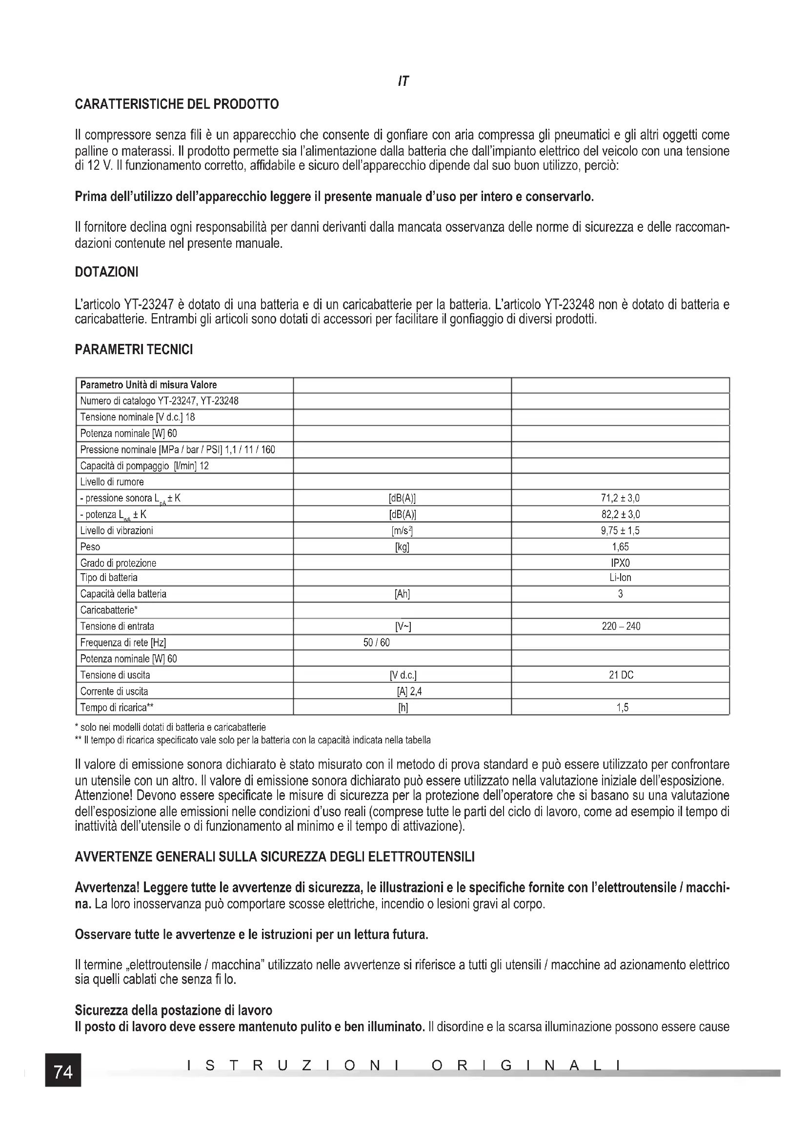 Il compressore senza fi li è un apparecchio che consente di gonfi are con aria compressa gli pneumatici e gli altri oggetti come palline o materassi. Il prodotto permette sia l’alimentazione dalla batteria che dall’impianto elettrico del veicolo con una tensione di 12 V. Il funzionamento corretto, affi dabile e sicuro dell’apparecchio dipende dal suo buon utilizzo, perciò: Prima dell’utilizzo dell’apparecchio leggere il presente manuale d’uso per intero e conservarlo. Il fornitore declina ogni responsabilità per danni derivanti dalla mancata osservanza delle norme di sicurezza e delle raccoman- dazioni contenute nel presente manuale. DOTAZIONI L’articolo YT-23247 è dotato di una batteria e di un caricabatterie per la batteria. L’articolo YT-23248 non è dotato di batteria e caricabatterie. Entrambi gli articoli sono dotati di accessori per facilitare il gonfi aggio di diversi prodotti. PARAMETRI TECNICI Parametro Unità di misura Valore Numero di catalogo YT-23247, YT-23248 Tensione nominale [V d.c.] 18 Potenza nominale [W] 60 Pressione nominale [MPa / bar / PSI] 1,1 / 11 / 160 Capacità di pompaggio [l/min] 12 Livello di rumore - pressione sonora L