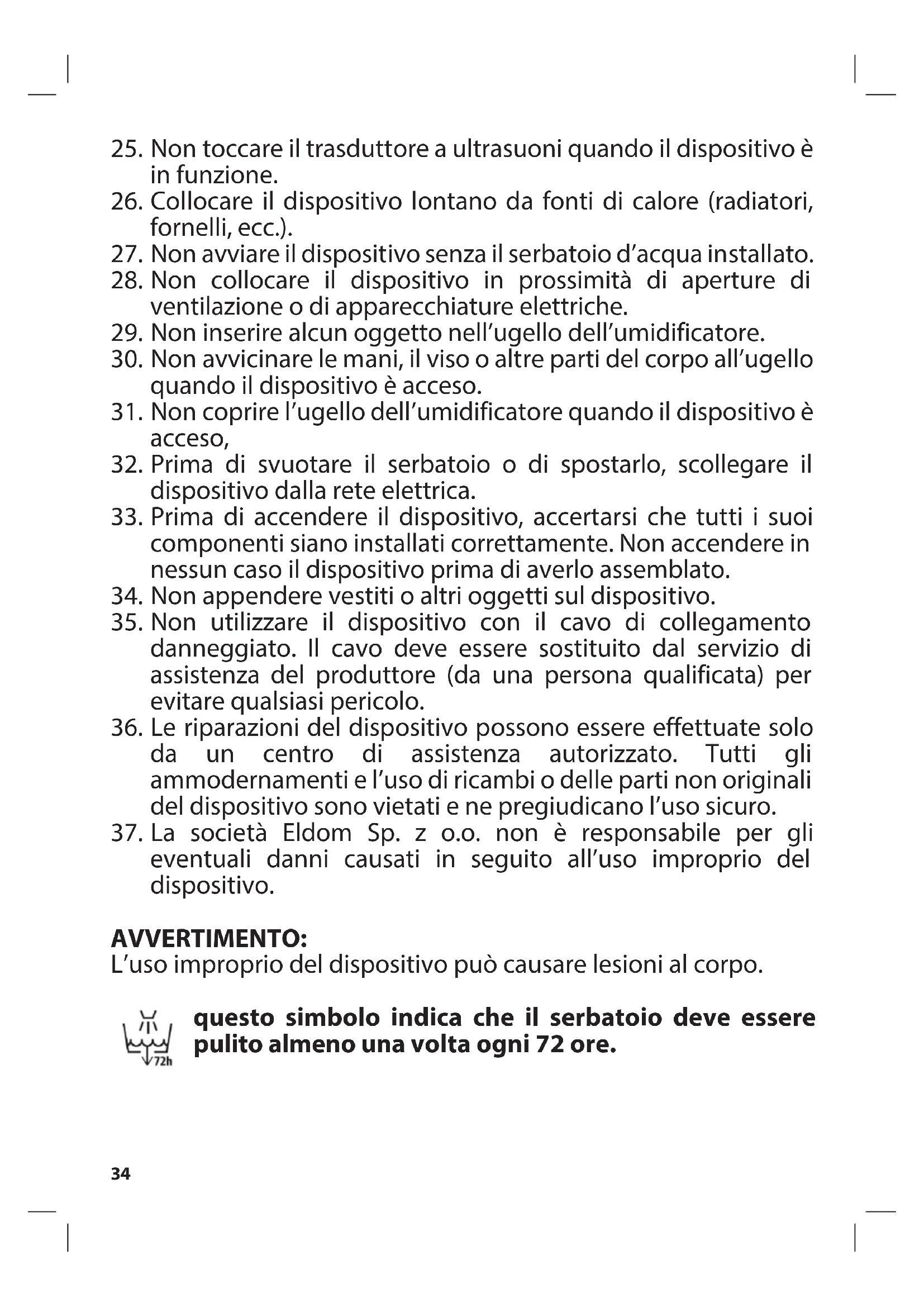 eventuali danni causati in seguito all’uso improprio del dispositivo. AVVERTIMENTO: L’uso improprio del dispositivo può causare lesioni al corpo. questo simbolo indica che il serbatoio deve essere pulito almeno una volta ogni 72 ore.