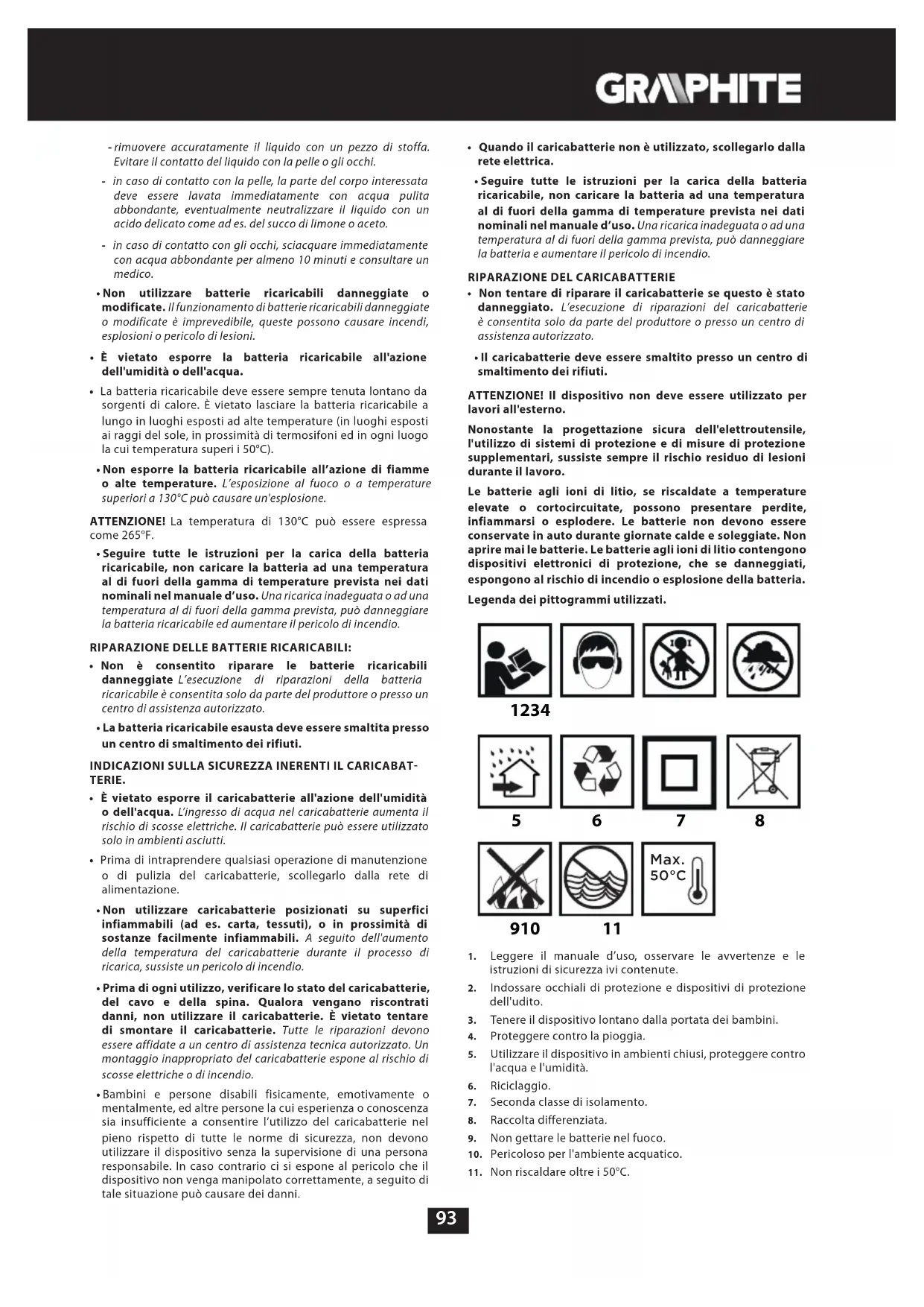 - Il caricabatterie deve essere smaltito presso un centro di smaltimento dei rifiuti. ATTENZIONE! Il dispositivo non deve essere utilizzato per lavori all'esterno. Nonostante la progettazione sicura dell'elettroutensile, l'utilizzo di sistemi di protezione e di misure di protezione supplementari, sussiste sempre il rischio residuo di lesioni durante il lavoro. Le batterie agli ioni di litio, se riscaldate a temperature elevate o cortocircuitate, possono presentare perdite, infiammarsi o esplodere. Le batterie non devono essere conservate in auto durante giornate calde e soleggiate. Non aprire mai le batterie. Le batterie agli ioni di litio contengono dispositivi elettronici di protezione, che se danneggiati, espongono al rischio di incendio o esplosione della batteria. Legenda dei pittogrammi utilizzati.
