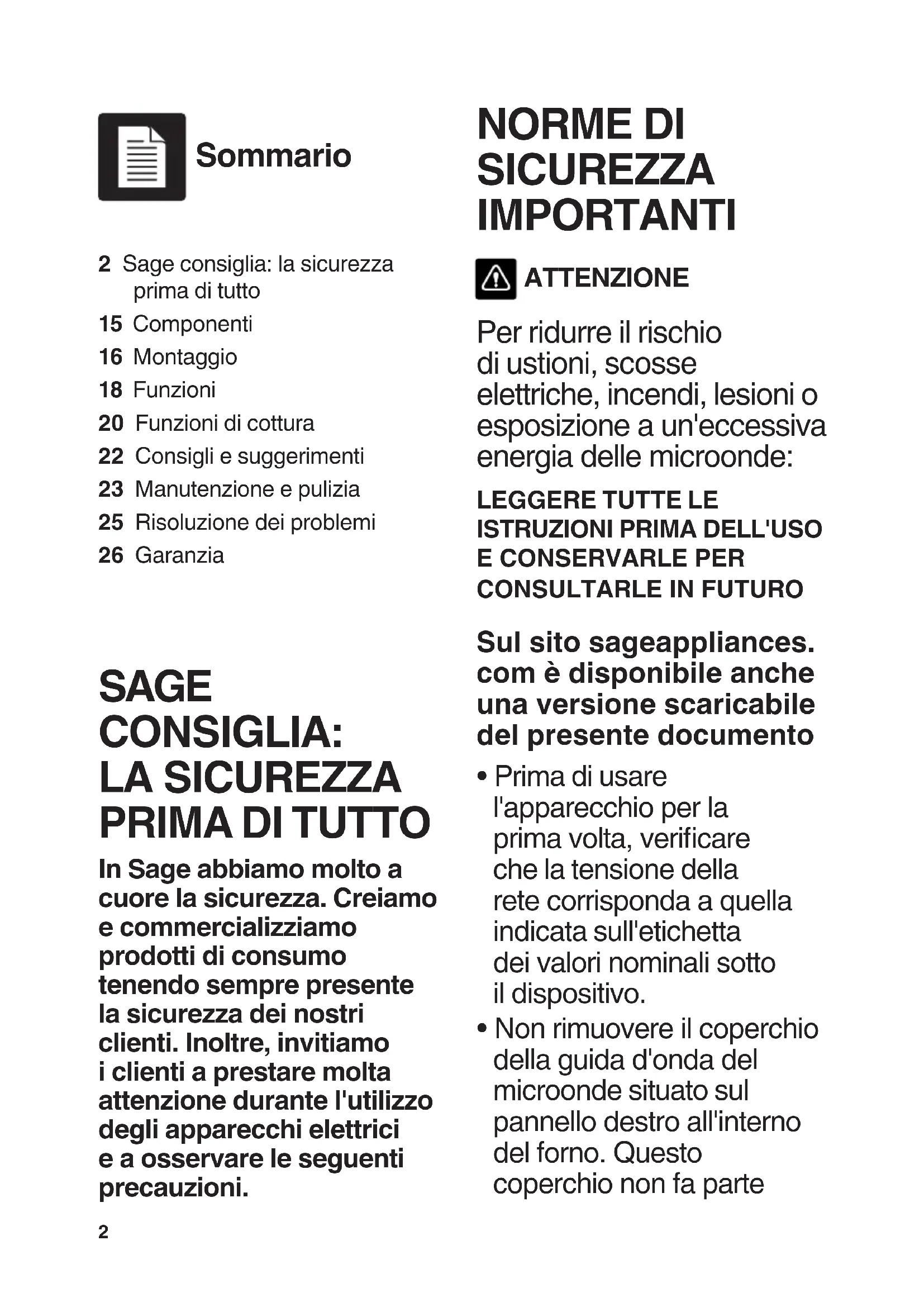 In Sage abbiamo molto a cuore la sicurezza. Creiamo e commercializziamo prodotti di consumo tenendo sempre presente la sicurezza dei nostri clienti. Inoltre, invitiamo i clienti a prestare molta attenzione durante l'utilizzo degli apparecchi elettrici e a osservare le seguenti precauzioni. NORME DI SICUREZZA IMPORTANTI ATTENZIONE Per ridurre il rischio di ustioni, scosse elettriche, incendi, lesioni o esposizione a un'eccessiva energia delle microonde: LEGGERE TUTTE LE ISTRUZIONI PRIMA DELL'USO E CONSERVARLE PER CONSULTARLE IN FUTURO Sul sito sageappliances. com è disponibile anche una versione scaricabile del presente documento