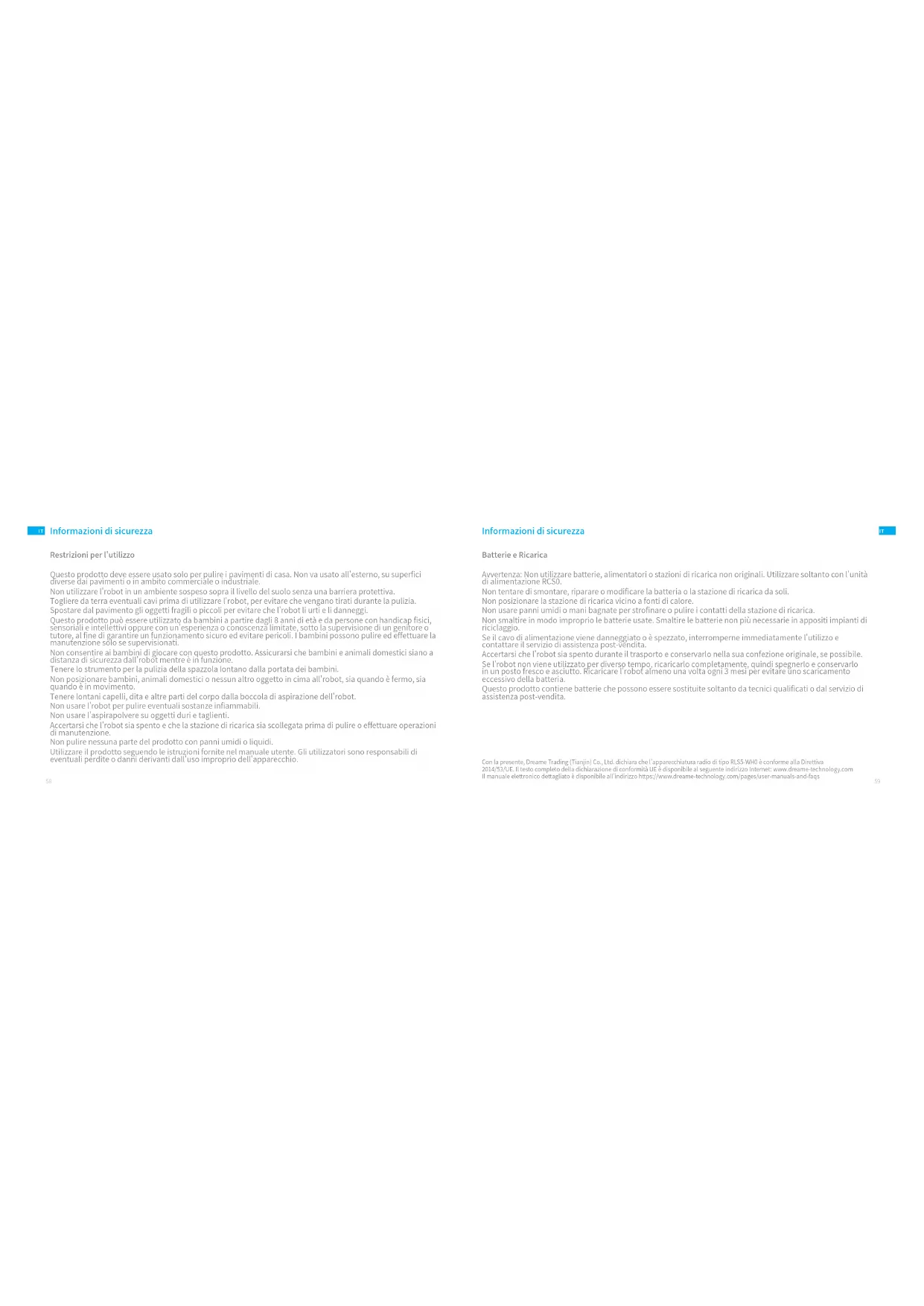 Batterie e Ricarica Informazioni di sicurezza Avvertenza: Non utilizzare batterie, alimentatori o stazioni di ricarica non originali. Utilizzare soltanto con l'unità di alimentazione RCS0. Non tentare di smontare, riparare o modificare la batteria o la stazione di ricarica da soli. Non posizionare la stazione di ricarica vicino a fonti di calore. Non usare panni umidi o mani bagnate per strofinare o pulire i contatti della stazione di ricarica. Non smaltire in modo improprio le batterie usate. Smaltire le batterie non più necessarie in appositi impianti di riciclaggio. Se il cavo di alimentazione viene danneggiato o è spezzato, interromperne immediatamente l'utilizzo e contattare il servizio di assistenza post-vendita. Accertarsi che l'robot sia spento durante il trasporto e conservarlo nella sua confezione originale, se possibile. Se l'robot non viene utilizzato per diverso tempo, ricaricarlo completamente, quindi spegnerlo e conservarlo in un posto fresco e asciutto. Ricaricare l'robot almeno una volta ogni 3 mesi per evitare uno scaricamento eccessivo della batteria. Questo prodotto contiene batterie che possono essere sostituite soltanto da tecnici qualificati o dal servizio di assistenza post-vendita. Con la presente, Dreame Trading (Tianjin) Co., Ltd. dichiara che l'apparecchiatura radio di tipo RLS5-WH0 è conforme alla Direttiva 2014/53/UE. Il testo completo della dichiarazione di conformità UE è disponibile al seguente indirizzo Internet: www.dreame-technology.com Il manuale elettronico dettagliato è disponibile all'indirizzo https://www.dreame-technology.com/pages/user-manuals-and-faqs Restrizioni per l'utilizzo Informazioni di sicurezza Questo prodotto deve essere usato solo per pulire i pavimenti di casa. Non va usato all'esterno, su superfici diverse dai pavimenti o in ambito commerciale o industriale. Non utilizzare l'robot in un ambiente sospeso sopra il livello del suolo senza una barriera protettiva. Togliere da terra eventuali cavi prima di utilizzare l'robot, per evitare che vengano tirati durante la pulizia. Spostare dal pavimento gli oggetti fragili o piccoli per evitare che l'robot li urti e li danneggi. Questo prodotto può essere utilizzato da bambini a partire dagli 8 anni di età e da persone con handicap fisici, sensoriali e intellettivi oppure con un'esperienza o conoscenza limitate, sotto la supervisione di un genitore o tutore, al fine di garantire un funzionamento sicuro ed evitare pericoli. I bambini possono pulire ed effettuare la manutenzione solo se supervisionati. Non consentire ai bambini di giocare con questo prodotto. Assicurarsi che bambini e animali domestici siano a distanza di sicurezza dall'robot mentre è in funzione. Tenere lo strumento per la pulizia della spazzola lontano dalla portata dei bambini. Non posizionare bambini, animali domestici o nessun altro oggetto in cima all'robot, sia quando è fermo, sia quando è in movimento. Tenere lontani capelli, dita e altre parti del corpo dalla boccola di aspirazione dell'robot. Non usare l'robot per pulire eventuali sostanze infiammabili. Non usare l'aspirapolvere su oggetti duri e taglienti. Accertarsi che l'robot sia spento e che la stazione di ricarica sia scollegata prima di pulire o effettuare operazioni di manutenzione. Non pulire nessuna parte del prodotto con panni umidi o liquidi. Utilizzare il prodotto seguendo le istruzioni fornite nel manuale utente. Gli utilizzatori sono responsabili di eventuali perdite o danni derivanti dall'uso improprio dell'apparecchio.60