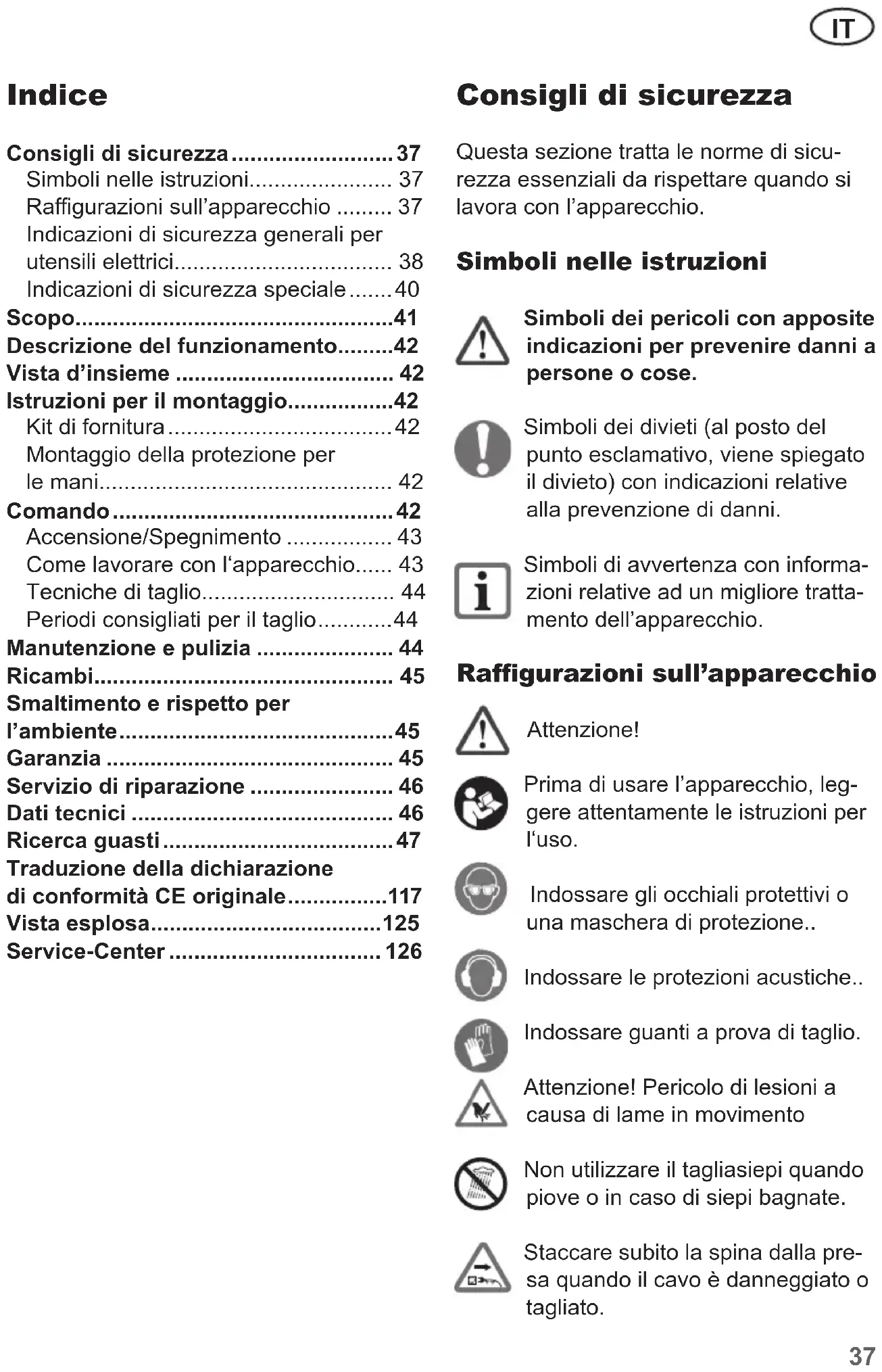 - Indossare guanti a prova di taglio. Attenzione! Pericolo di lesioni a causa di lame in movimento Non utilizzare il tagliasiepi quando piove o in caso di siepi bagnate. Staccare subito la spina dalla pre- sa quando il cavo è danneggiato o tagliato. Traduzione della dichiarazione di conformità CE originale p. 117