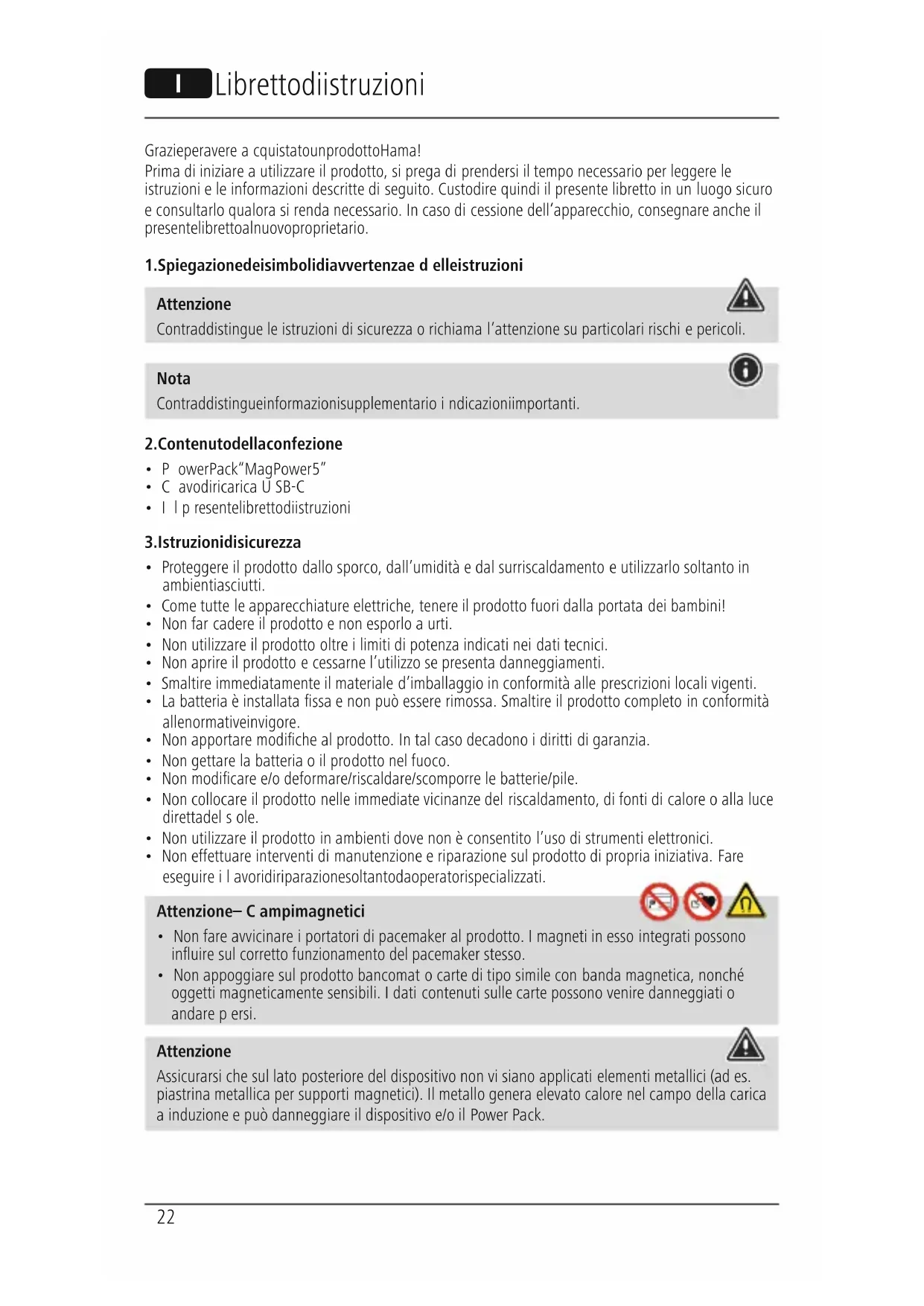 - Non appoggiaresul prodotto bancomat ocarte di tiposimile con banda magnetica, nonché oggetti magneticamente sensibili. Idati contenuti sulle carte possonoveniredanneggiati o andarepersi. Attenzione Assicurarsi che sul lato posterioredel dispositivo non vi sianoapplicati elementi metallici (ad es. piastrina metallica per supporti magnetici). Il metallo generaelevato calorenel campo della carica ainduzione epuò danneggiareildispositivo e/o il Power Pack. I Libretto di istruzioni23