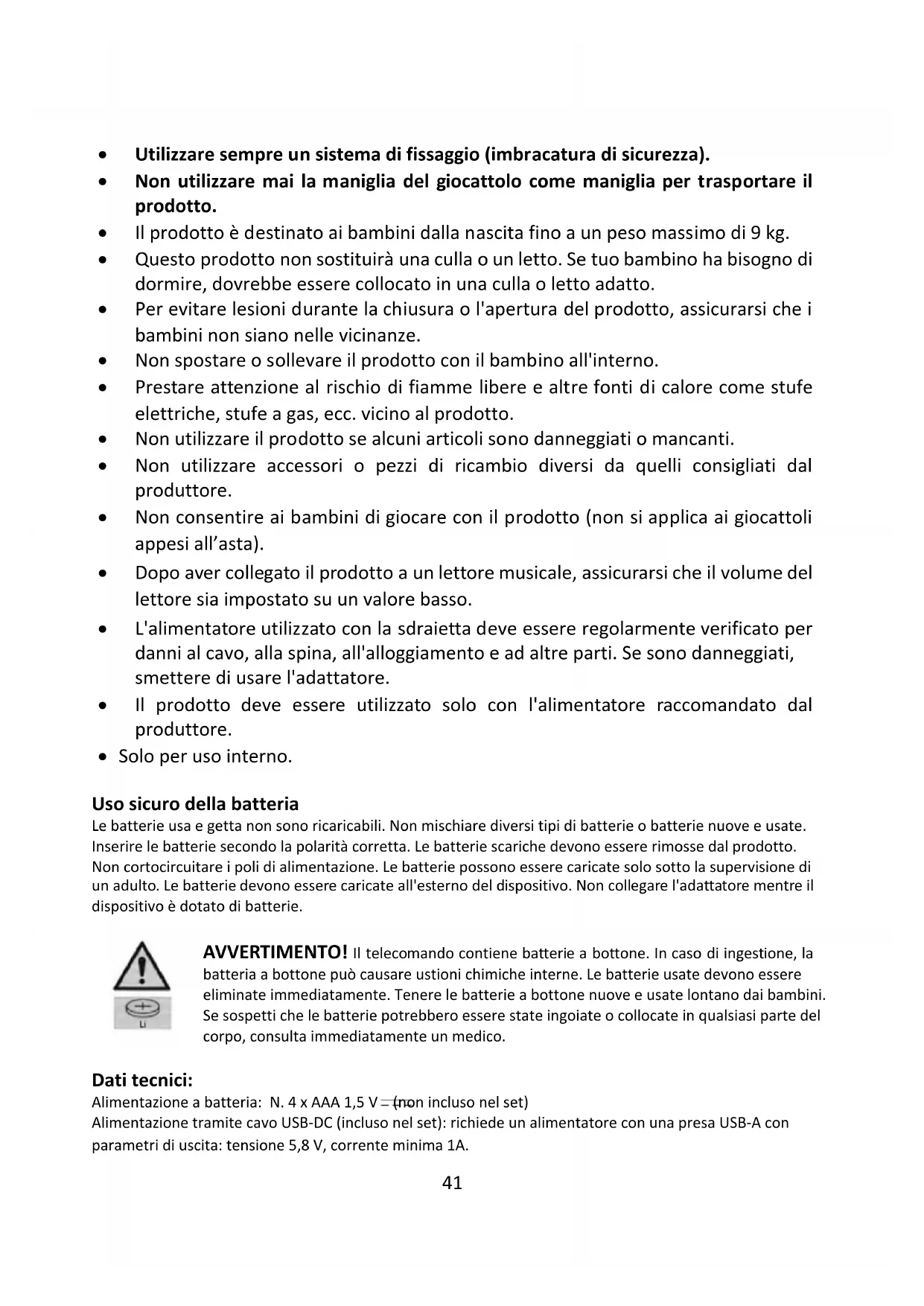 - Solo per uso interno. Uso sicuro della batteria Le batterie usa e getta non sono ricaricabili. Non mischiare diversi tipi di batterie o batterie nuove e usate. Inserire le batterie secondo la polarità corretta. Le batterie scariche devono essere rimosse dal prodotto. Non cortocircuitare i poli di alimentazione. Le batterie possono essere caricate solo sotto la supervisione di un adulto. Le batterie devono essere caricate all'esterno del dispositivo. Non collegare l'adattatore mentre il dispositivo è dotato di batterie. AVVERTIMENTO! Il telecomando contiene batterie a bottone. In caso di ingestione, la batteria a bottone può causare ustioni chimiche interne. Le batterie usate devono essere eliminate immediatamente. Tenere le batterie a bottone nuove e usate lontano dai bambini. Se sospetti che le batterie potrebbero essere state ingoiate o collocate in qualsiasi parte del corpo, consulta immediatamente un medico. Dati tecnici: Alimentazione a batteria: N. 4 x AAA 1,5 V (non incluso nel set) Alimentazione tramite cavo USB-DC (incluso nel set): richiede un alimentatore con una presa USB-A con parametri di uscita: tensione 5,8 V, corrente minima 1A.42