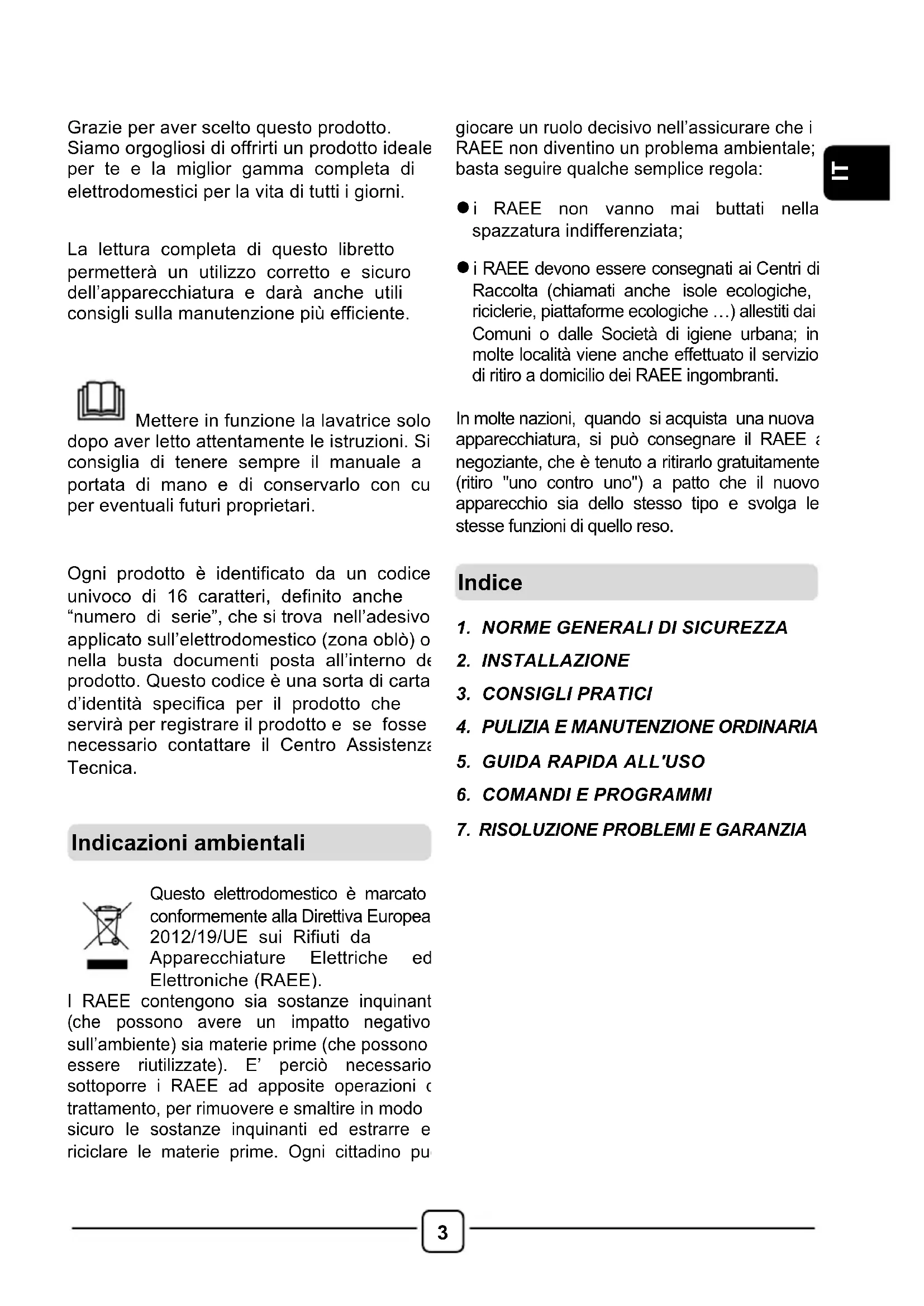 Grazie per aver scelto questo prodotto. Siamo orgogliosi di offrirti un prodotto ideale per te e la miglior gamma completa di elettrodomestici per la vita di tutti i giorni. La lettura completa di questo libretto permetterà un utilizzo corretto e sicuro dell’apparecchiatura e darà anche utili consigli sulla manutenzione più efficiente. Mettere in funzione la lavatrice solo dopo aver letto attentamente le istruzioni. Si consiglia di tenere sempre il manuale a portata di mano e di conservarlo con cura per eventuali futuri proprietari. Ogni prodotto è identificato da un codice univoco di 16 caratteri, definito anche “numero di serie”, che si trova nell’adesivo applicato sull’elettrodomestico (zona oblò) o nella busta documenti posta all’interno del prodotto. Questo codice è una sorta di carta d’identità specifica per il prodotto che servirà per registrare il prodotto e se fosse necessario contattare il Centro Assistenza Tecnica.
