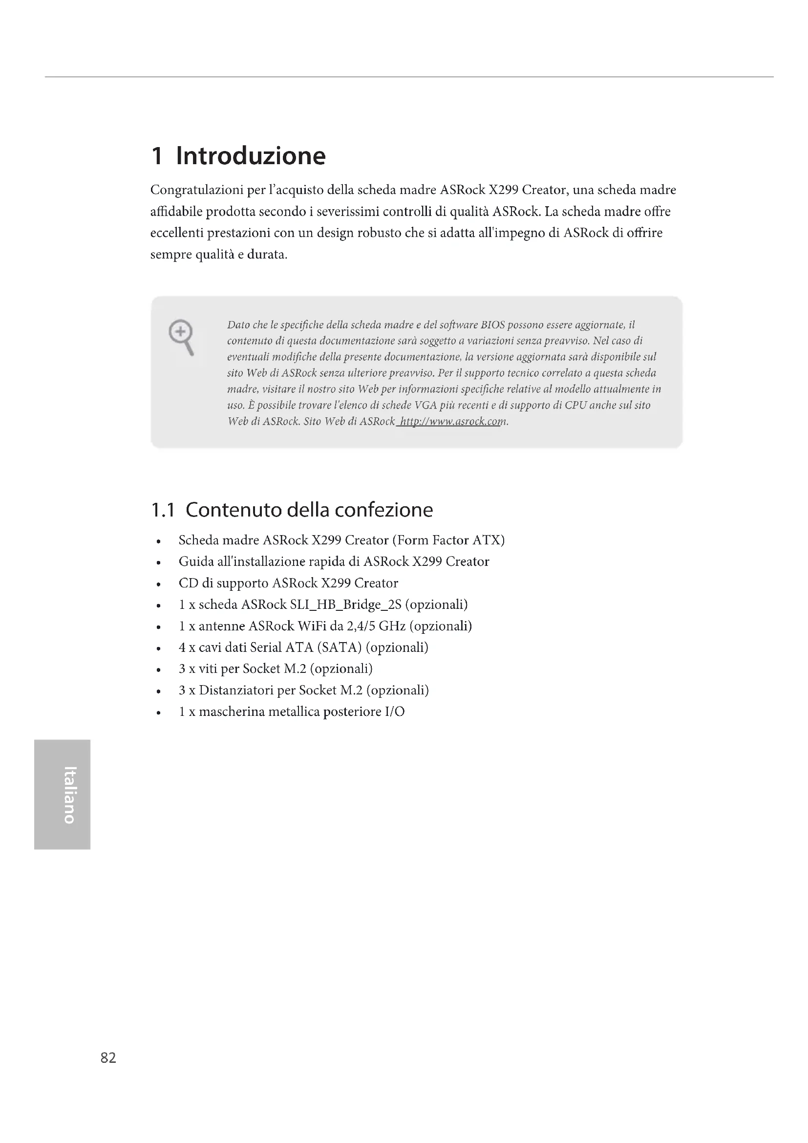 - 1 x mascherina metallica posteriore I/O Dato che le speciche della scheda madre e del soware BIOS possono essere aggiornate, il contenuto di questa documentazione sarà soggetto a variazioni senza preavviso. Nel caso di eventuali modiche della presente documentazione, la versione aggiornata sarà disponibile sul sito Web di ASRock senza ulteriore preavviso. Per il supporto tecnico correlato a questa scheda madre, visitare il nostro sito Web per informazioni speciche relative al modello attualmente in uso. È possibile trovare l'elenco di schede VGA più recenti e di supporto di CPU anche sul sito Web di ASRock. Sito Web di ASRock http://www.asrock.com.83 X299 Creator Italiano