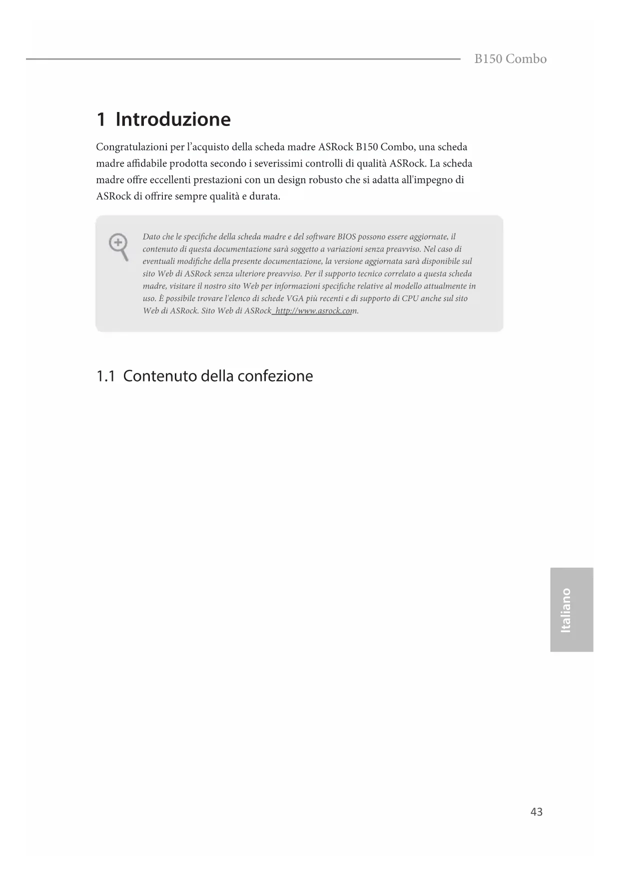 Italiano B150 Combo 1 Introduzione Congratulazioni per l’acquisto della scheda madre ASRock B150 Combo, una scheda madre adabile prodotta secondo i severissimi controlli di qualità ASRock. La scheda madre ore eccellenti prestazioni con un design robusto che si adatta all'impegno di ASRock di orire sempre qualità e durata.