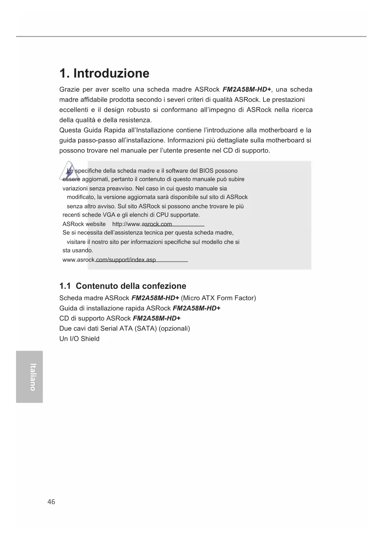 Grazie per aver scelto una scheda madre ASRock FM2A58M-HD+, una scheda madreafdabileprodottasecondoisevericriteridiqualitàASRock.Leprestazioni eccellenti e il design robusto si conformano all’impegno di ASRock nella ricerca della qualità e della resistenza. Questa Guida Rapida all’Installazione contiene l’introduzione alla motherboard e la guidapasso-passoall’installazione.Informazionipiùdettagliatesullamotherboardsi possono trovare nel manuale per l’utente presente nel CD di supporto. LespecichedellaschedamadreeilsoftwaredelBIOSpossono essere aggiornati, pertanto il contenuto di questo manuale può subire variazioni senza preavviso. Nel caso in cui questo manuale sia modicato,laversioneaggiornatasaràdisponibilesulsitodiASRock senzaaltroavviso.SulsitoASRocksipossonoanchetrovarelepiù recenti schede VGA e gli elenchi di CPU supportate. ASRock website http://www.asrock.com Se si necessita dell’assistenza tecnica per questa scheda madre, visitareilnostrositoperinformazionispecichesulmodellochesi sta usando. www.asrock.com/support/index.asp