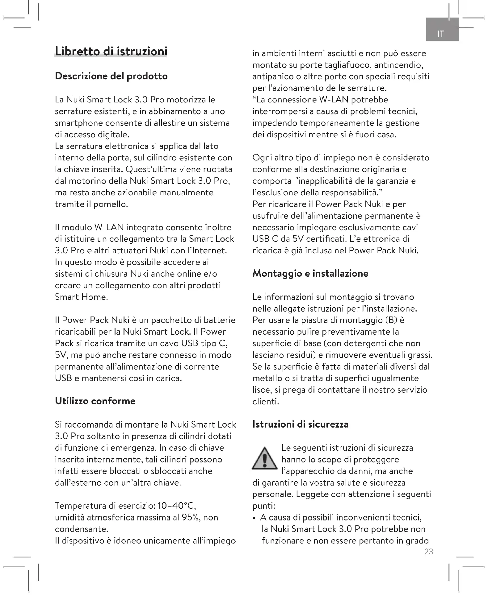 - A causa di possibili inconvenienti tecnici, la Nuki Smart Lock 3.0 Pro potrebbe non funzionare e non essere pertanto in grado IT24 di aprire la porta. Portate sempre con voi la chiave associata al cilindro o lasciatela in un luogo raggiungibile per consentirvi di aprire la porta manualmente in caso di avaria.