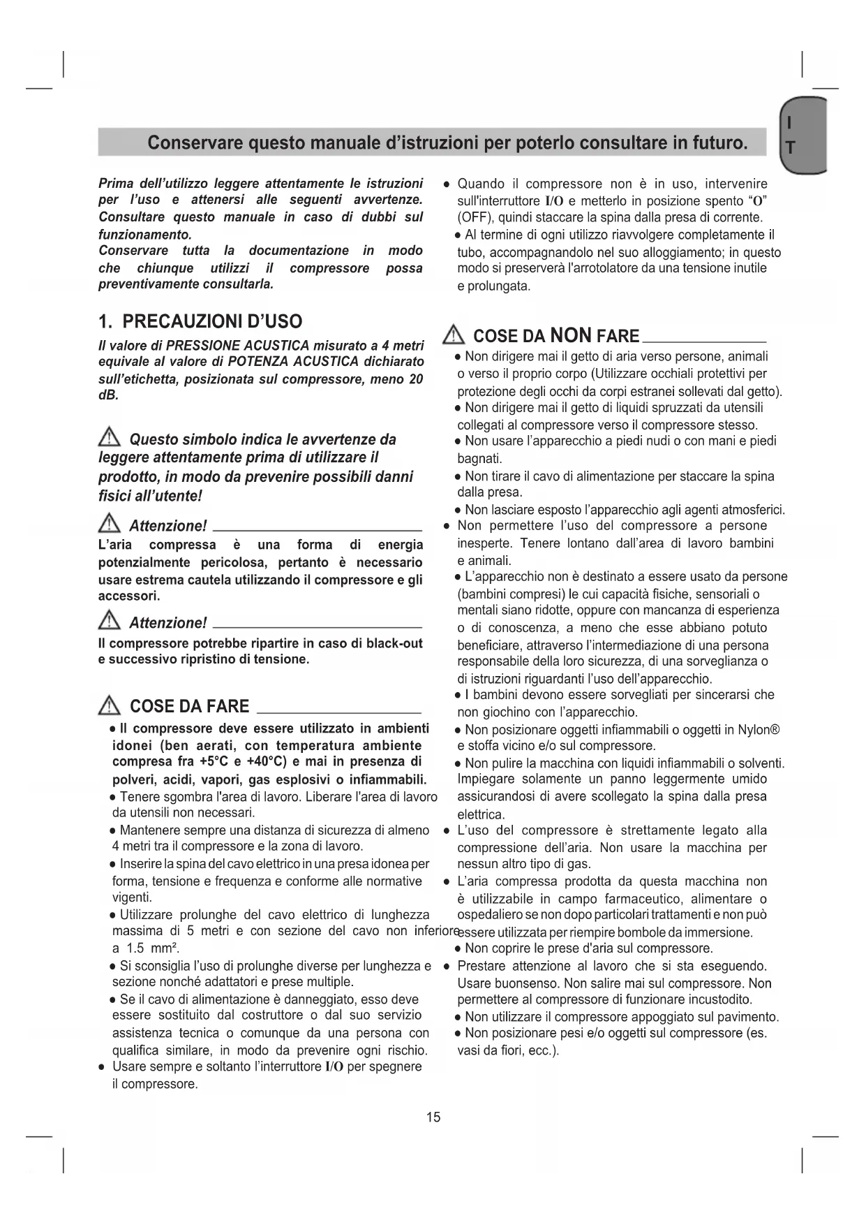 Prima dell’utilizzo leggere attentamente le istruzioni per l’uso e attenersi alle seguenti avvertenze. Consultare questo manuale in caso di dubbi sul funzionamento. Conservare tutta la documentazione in modo che chiunque utilizzi il compressore possa preventivamente consultarla.