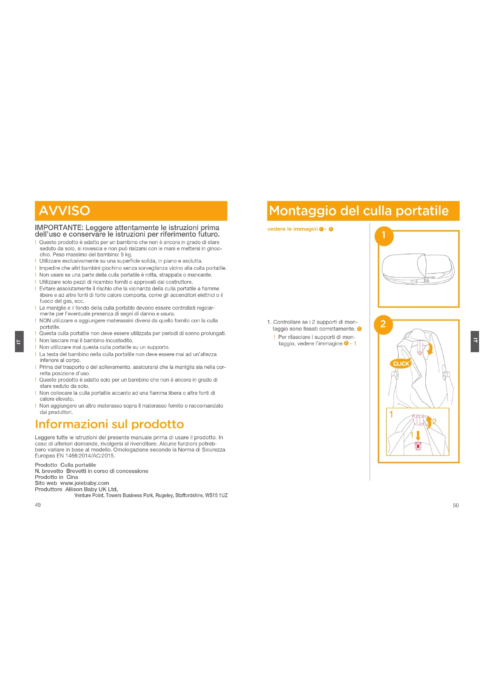 AVVISO IMPORTANTE: Leggere attentamente le istruzioni prima dell’uso e conservare le istruzioni per riferimento futuro.! Questo prodotto è adatto per un bambino che non è ancora in grado di stare seduto da solo, si rovescia e non può rialzarsi con le mani e mettersi in ginoc-chio. Peso massimo del bambino: 9 kg.! Utilizzare esclusivamente su una superficie solida, in piano e asciutta.! Impedire che altri bambini giochino senza sorveglianza vicino alla culla portatile.! Non usare se una parte della culla portatile è rotta, strappata o mancante.! Utilizzare solo pezzi di ricambio forniti o approvati dal costruttore.! Evitare assolutamente il rischio che la vicinanza della culla portatile a fiamme libere e ad altre fonti di forte calore comporta, come gli accenditori elettrici o il fuoco del gas, ecc.! Le maniglie e il fondo della culla portatile devono essere controllati regolar-mente per l’eventuale presenza di segni di danno e usura.! NON utilizzare o aggiungere materassini diversi da quello fornito con la culla portatile.! Questa culla portatile non deve essere utilizzata per periodi di sonno prolungati.! Non lasciare mai il bambino incustodito.! Non utilizzare mai questa culla portatile su un supporto.! La testa del bambino nella culla portatile non deve essere mai ad un’altezza inferiore al corpo.! Prima del trasporto o del sollevamento, assicurarsi che la maniglia sia nella cor-retta posizione d’uso.! Questo prodotto è adatto solo per un bambino che non è ancora in grado di stare seduto da solo.! Non collocare la culla portatile accanto ad una fiamma libera o altre fonti di calore elevato.! Non aggiungere un altro materasso sopra il materasso fornito o raccomandato dai produttori. Informazioni sul prodotto Leggere tutte le istruzioni del presente manuale prima di usare il prodotto. In caso di ulteriori domande, rivolgersi al rivenditore. Alcune funzioni potreb-bero variare in base al modello. Omologazione secondo la Norma di Sicurezza Europea EN 1466:2014/AC:2015. Prodotto Culla portatileN. brevetto Brevetti in corso di concessioneProdotto in CinaSito web www.joiebaby.comProduttore Allison Baby UK Ltd, Venture Point, Towers Business Park, Rugeley, Staffordshire, WS15 1UZ Montaggio del culla portatile vedere le immagini