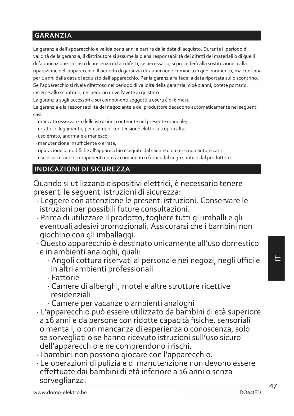 - Non utilizzare l’apparecchio con una presa multipla. Non utilizzare mai l’apparecchio con una prolunga.49 DO641ED www.domo-elektro.be