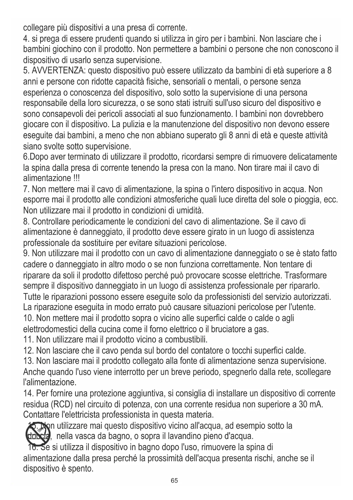 21. Non utilizzare mai il termoventilatore in stanze con umidità elevata - bagno, doccia,