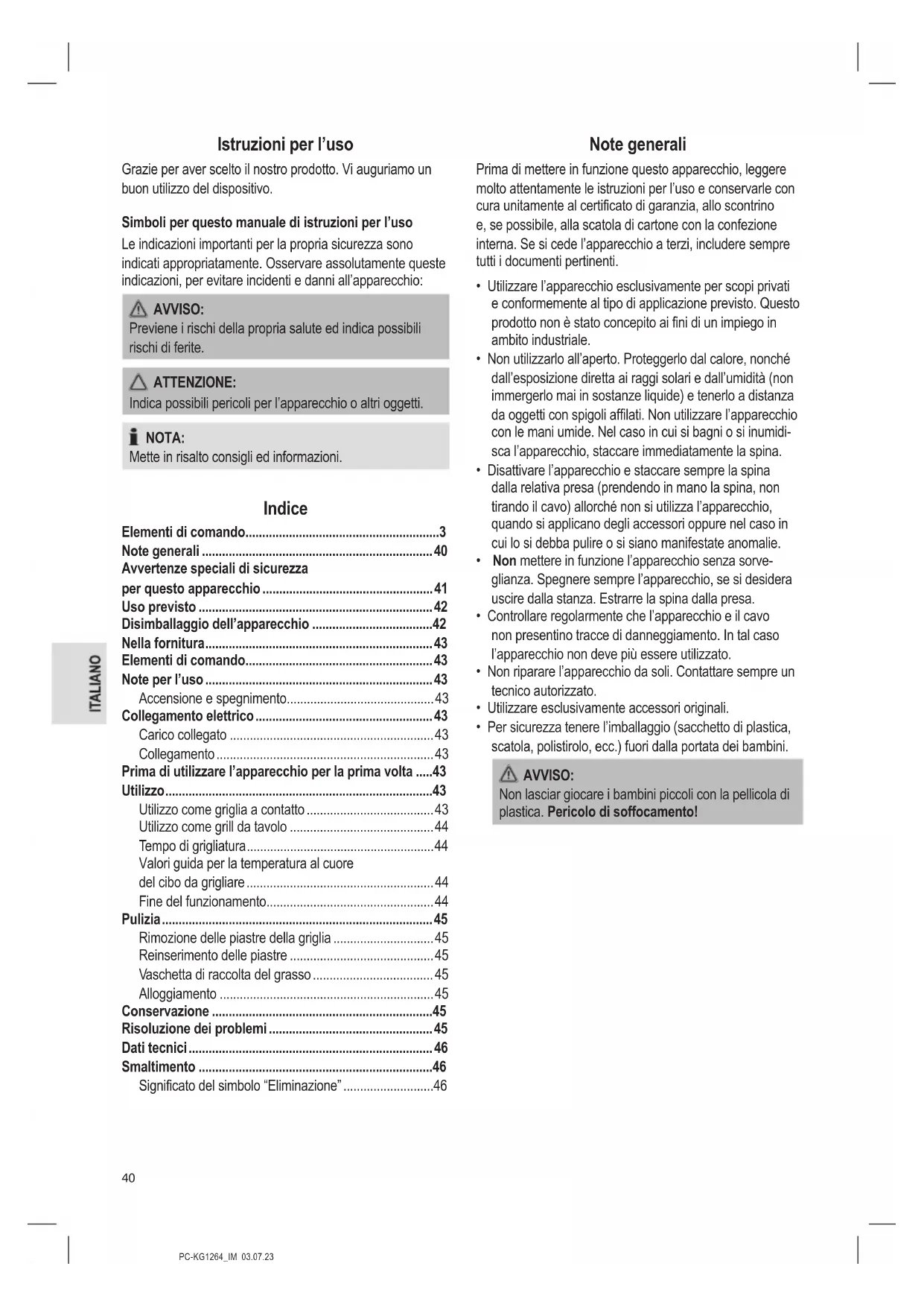 - Per sicurezza tenere l’imballaggio (sacchetto di plastica, scatola, polistirolo, ecc.) fuori dalla portata dei bambini. AVVISO: Non lasciar giocare i bambini piccoli con la pellicola di plastica. Pericolo di soffocamento!PC-KG1264_IM 03.07.23
