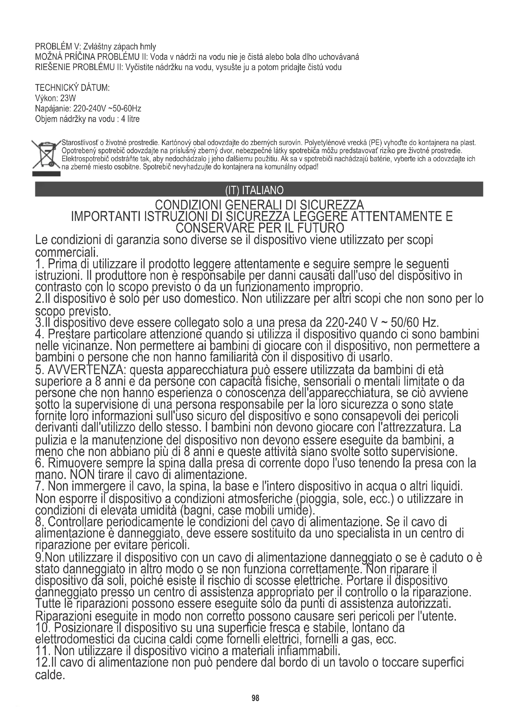 12.Il cavo di alimentazione non può pendere dal bordo di un tavolo o toccare superfici calde. PROBLÉM V: Zvláštny zápach hmly MOŽNÁ PRÍČINA PROBLÉMU II: Voda v nádrži na vodu nie je čistá alebo bola dlho uchovávaná RIEŠENIE PROBLÉMU II: Vyčistite nádržku na vodu, vysušte ju a potom pridajte čistú vodu TECHNICKÝ DÁTUM: Výkon: 23W Napájanie: 220-240V ~50-60Hz Objem nádržky na vodu : 4 litre99 13.Non lasciare mai il prodotto collegato alla fonte di alimentazione senza supervisione. Anche quando l'utilizzo viene interrotto per breve tempo, spegnerlo dalla rete, scollegare l'alimentazione.