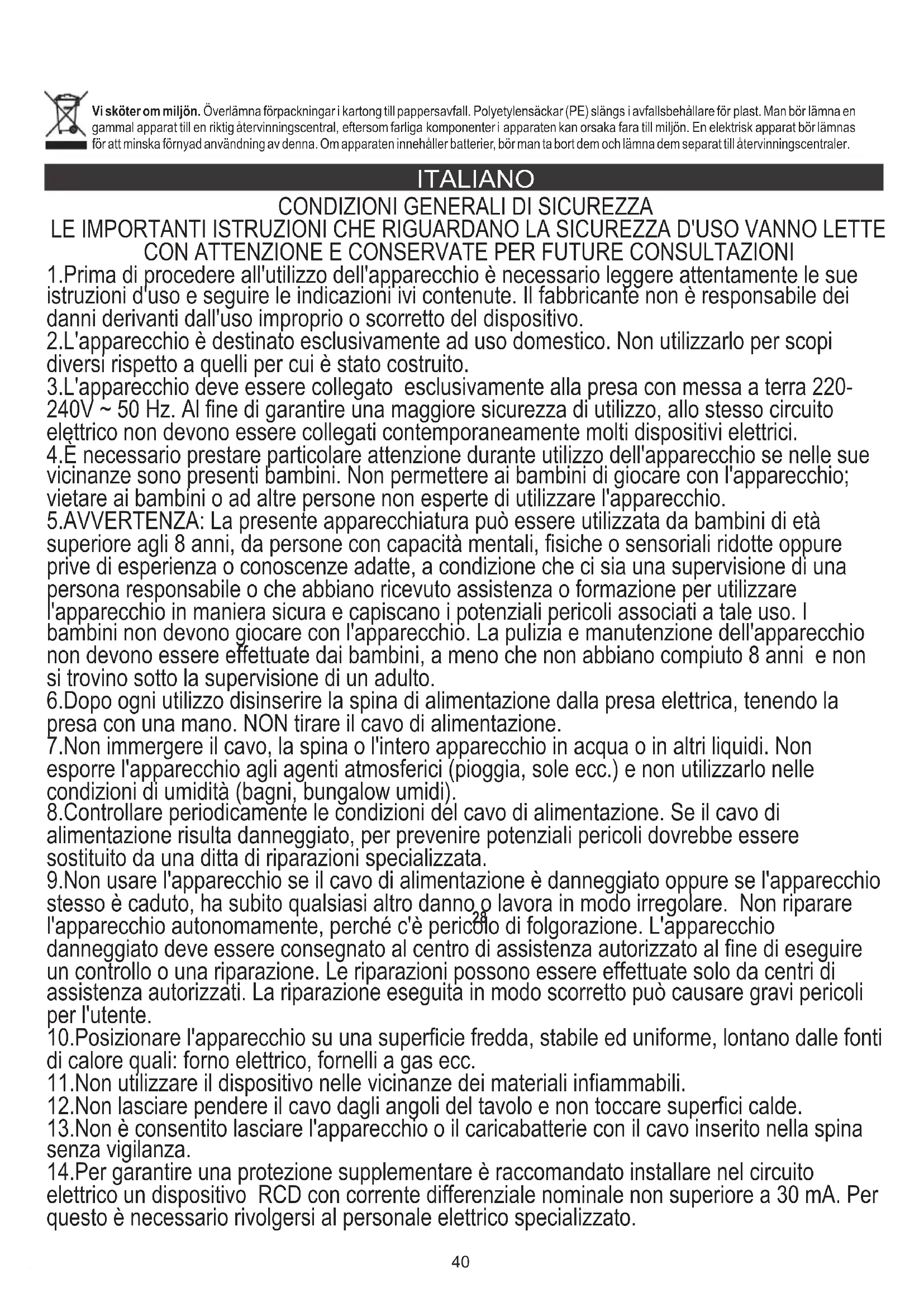 LE IMPORTANTI ISTRUZIONI CHE RIGUARDANO LA SICUREZZA D'USO VANNO LETTE CON ATTENZIONE E CONSERVATE PER FUTURE CONSULTAZIONI 1.Prima di procedere all'utilizzo dell'apparecchio è necessario leggere attentamente le sue istruzioni d'uso e seguire le indicazioni ivi contenute. Il fabbricante non è responsabile dei danni derivanti dall'uso improprio o scorretto del dispositivo. 2.L'apparecchio è destinato esclusivamente ad uso domestico. Non utilizzarlo per scopi diversi rispetto a quelli per cui è stato costruito. 3.L'apparecchio deve essere collegato esclusivamente alla presa con messa a terra 220- 240V ~ 50 Hz. Al fine di garantire una maggiore sicurezza di utilizzo, allo stesso circuito elettrico non devono essere collegati contemporaneamente molti dispositivi elettrici. 4.È necessario prestare particolare attenzione durante utilizzo dell'apparecchio se nelle sue vicinanze sono presenti bambini. Non permettere ai bambini di giocare con l'apparecchio; vietare ai bambini o ad altre persone non esperte di utilizzare l'apparecchio. 5.AVVERTENZA: La presente apparecchiatura può essere utilizzata da bambini di età superiore agli 8 anni, da persone con capacità mentali, fisiche o sensoriali ridotte oppure prive di esperienza o conoscenze adatte, a condizione che ci sia una supervisione di una persona responsabile o che abbiano ricevuto assistenza o formazione per utilizzare l'apparecchio in maniera sicura e capiscano i potenziali pericoli associati a tale uso. I bambini non devono giocare con l'apparecchio. La pulizia e manutenzione dell'apparecchio non devono essere effettuate dai bambini, a meno che non abbiano compiuto 8 anni e non si trovino sotto la supervisione di un adulto. 6.Dopo ogni utilizzo disinserire la spina di alimentazione dalla presa elettrica, tenendo la presa con una mano. NON tirare il cavo di alimentazione. 7.Non immergere il cavo, la spina o l'intero apparecchio in acqua o in altri liquidi. Non esporre l'apparecchio agli agenti atmosferici (pioggia, sole ecc.) e non utilizzarlo nelle condizioni di umidità (bagni, bungalow umidi). 8.Controllare periodicamente le condizioni del cavo di alimentazione. Se il cavo di alimentazione risulta danneggiato, per prevenire potenziali pericoli dovrebbe essere sostituito da una ditta di riparazioni specializzata. 9.Non usare l'apparecchio se il cavo di alimentazione è danneggiato oppure se l'apparecchio stesso è caduto, ha subito qualsiasi altro danno o lavora in modo irregolare. Non riparare l'apparecchio autonomamente, perché c'è pericolo di folgorazione. L'apparecchio danneggiato deve essere consegnato al centro di assistenza autorizzato al fine di eseguire un controllo o una riparazione. Le riparazioni possono essere effettuate solo da centri di assistenza autorizzati. La riparazione eseguita in modo scorretto può causare gravi pericoli per l'utente. 10.Posizionare l'apparecchio su una superficie fredda, stabile ed uniforme, lontano dalle fonti di calore quali: forno elettrico, fornelli a gas ecc. 11.Non utilizzare il dispositivo nelle vicinanze dei materiali infiammabili. 12.Non lasciare pendere il cavo dagli angoli del tavolo e non toccare superfici calde. 13.Non è consentito lasciare l'apparecchio o il caricabatterie con il cavo inserito nella spina senza vigilanza. 14.Per garantire una protezione supplementare è raccomandato installare nel circuito elettrico un dispositivo RCD con corrente differenziale nominale non superiore a 30 mA. Per questo è necessario rivolgersi al personale elettrico specializzato.