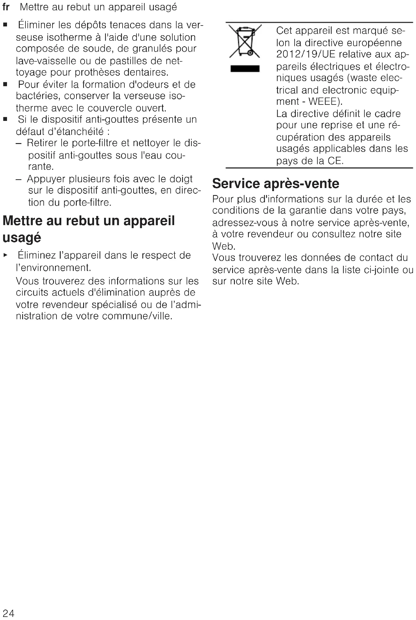 - Fig. 28 Note ¡ Dopo ogni utilizzo lavare e sciacquare accuratamente tutte le parti. ¡ Rimuovere lo sporco ostinato dalla caraf- fa termica con una soluzione di soda, detersivo granulare per lavastoviglie o pastiglie per dentiere. ¡ Per evitare la formazione di odori e di batteri, conservare la caraffa termica con il coperchio aperto. ¡ Se il blocco antigocciolamento perde: – Togliere il supporto filtro e lavare il blocco antigocciolamento sotto ac- qua corrente. – Premere più volte con il dito il blocco antigocciolamento in direzione del supporto filtro. Rottamazione di un apparec- chio dismesso ▶ Smaltire l'apparecchio nel rispetto dell'ambiente. Per informazioni sulle attuali procedure di smaltimento rivolgersi al rivenditore specializzato o al comune di competen- za.