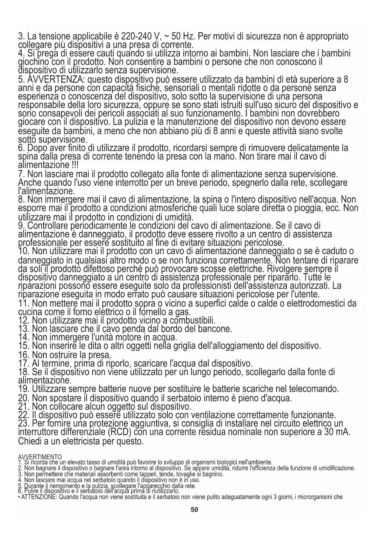 1. Si ricorda che un elevato tasso di umidità può favorire lo sviluppo di organismi biologici nell'ambiente.