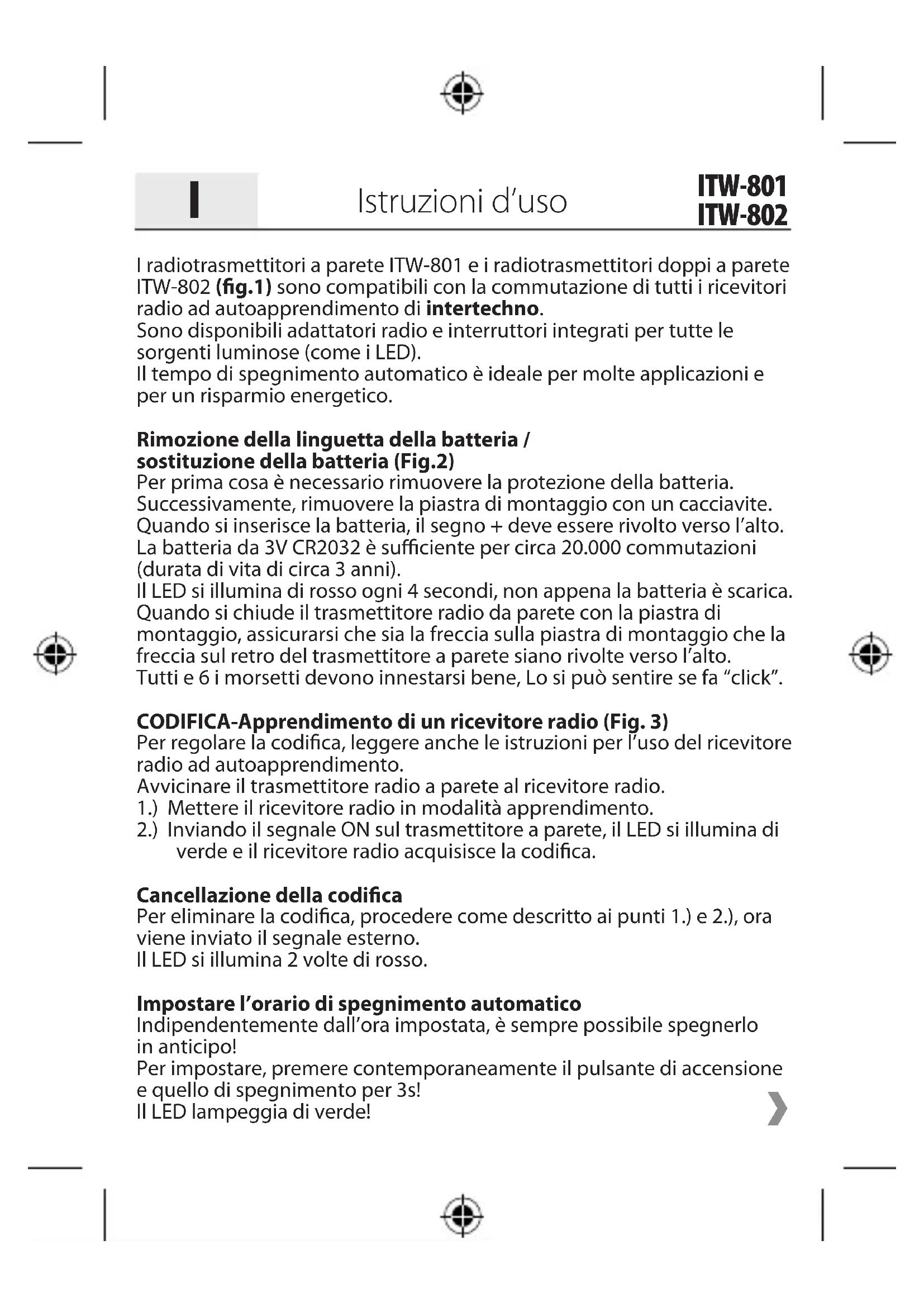 Uputa za rukovanje ITW-801 ITW-802I radiotrasmettitori a parete ITW-801 e i radiotrasmettitori doppi a parete ITW-802 (fig.1) sono compatibili con la commutazione di tutti i ricevitori radio ad autoapprendimento di intertechno. Sono disponibili adattatori radio e interruttori integrati per tutte le sorgenti luminose (come i LED). Il tempo di spegnimento automatico è ideale per molte applicazioni e per un risparmio energetico. Rimozione della linguetta della batteria / sostituzione della batteria (Fig.2) Per prima cosa è necessario rimuovere la protezione della batteria. Successivamente, rimuovere la piastra di montaggio con un cacciavite. Quando si inserisce la batteria, il segno + deve essere rivolto verso l’alto. La batteria da 3V CR2032 è sufficiente per circa 20.000 commutazioni (durata di vita di circa 3 anni). Il LED si illumina di rosso ogni 4 secondi, non appena la batteria è scarica. Quando si chiude il trasmettitore radio da parete con la piastra di montaggio, assicurarsi che sia la freccia sulla piastra di montaggio che la freccia sul retro del trasmettitore a parete siano rivolte verso l’alto. Tutti e 6 i morsetti devono innestarsi bene, Lo si può sentire se fa “click”. CODIFICA-Apprendimento di un ricevitore radio (Fig. 3) Per regolare la codifica, leggere anche le istruzioni per l’uso del ricevitore radio ad autoapprendimento. Avvicinare il trasmettitore radio a parete al ricevitore radio. 1.) Mettere il ricevitore radio in modalità apprendimento. 2.) Inviando il segnale ON sul trasmettitore a parete, il LED si illumina di verde e il ricevitore radio acquisisce la codifica. Cancellazione della codifica Per eliminare la codifica, procedere come descritto ai punti 1.) e 2.), ora viene inviato il segnale esterno. Il LED si illumina 2 volte di rosso. Impostare l’orario di spegnimento automatico Indipendentemente dall’ora impostata, è sempre possibile spegnerlo in anticipo! Per impostare, premere contemporaneamente il pulsante di accensione e quello di spegnimento per 3s! Il LED lampeggia di verde!
