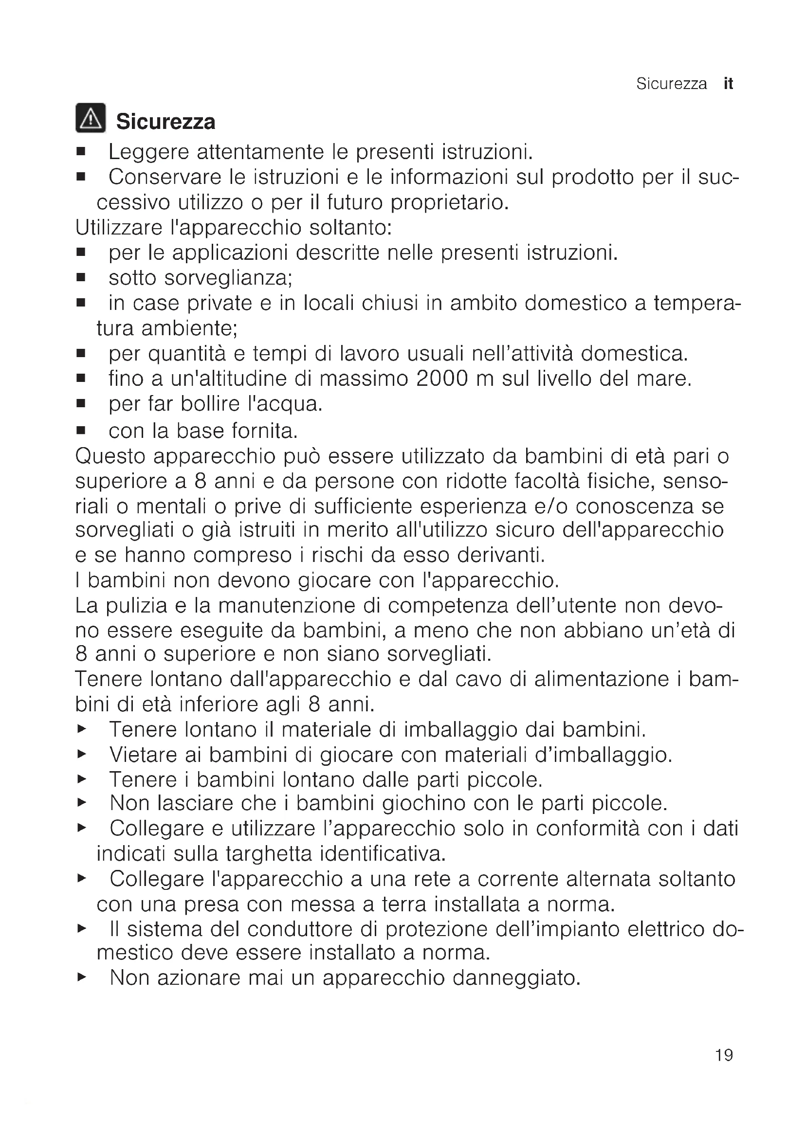 Sicurezza ¡ Leggere attentamente le presenti istruzioni. ¡ Conservare le istruzioni e le informazioni sul prodotto per il suc- cessivo utilizzo o per il futuro proprietario. Utilizzare l'apparecchio soltanto: ¡ per le applicazioni descritte nelle presenti istruzioni. ¡ sotto sorveglianza; ¡ in case private e in locali chiusi in ambito domestico a tempera- tura ambiente; ¡ per quantità e tempi di lavoro usuali nell’attività domestica. ¡ fino a un'altitudine di massimo 2000m sul livello del mare. ¡ per far bollire l'acqua. ¡ con la base fornita. Questo apparecchio può essere utilizzato da bambini di età pari o superiore a 8 anni e da persone con ridotte facoltà fisiche, senso- riali o mentali o prive di sufficiente esperienza e/o conoscenza se sorvegliati o già istruiti in merito all'utilizzo sicuro dell'apparecchio e se hanno compreso i rischi da esso derivanti. I bambini non devono giocare con l'apparecchio. La pulizia e la manutenzione di competenza dell’utente non devo- no essere eseguite da bambini, a meno che non abbiano un’età di 8 anni o superiore e non siano sorvegliati. Tenere lontano dall'apparecchio e dal cavo di alimentazione i bam- bini di età inferiore agli 8 anni. ▶ Tenere lontano il materiale di imballaggio dai bambini. ▶ Vietare ai bambini di giocare con materiali d’imballaggio. ▶ Tenere i bambini lontano dalle parti piccole. ▶ Non lasciare che i bambini giochino con le parti piccole. ▶ Collegare e utilizzare l’apparecchio solo in conformità con i dati indicati sulla targhetta identificativa. ▶ Collegare l'apparecchio a una rete a corrente alternata soltanto con una presa con messa a terra installata a norma. ▶ Ilsistema delconduttore diprotezione dell’impianto elettrico do- mestico deve essere installato anorma. ▶ Non azionare mai un apparecchio danneggiato.it Sicurezza