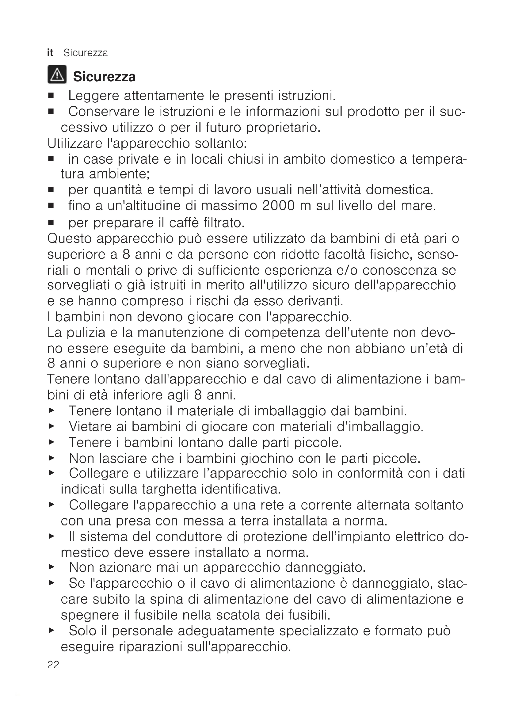 Sicurezza ¡ Leggere attentamente le presenti istruzioni. ¡ Conservare le istruzioni e le informazioni sul prodotto per il suc- cessivo utilizzo o per il futuro proprietario. Utilizzare l'apparecchio soltanto: ¡ in case private e in locali chiusi in ambito domestico a tempera- tura ambiente; ¡ per quantità e tempi di lavoro usuali nell’attività domestica. ¡ fino a un'altitudine di massimo 2000m sul livello del mare. ¡ per preparare il caffè filtrato. Questo apparecchio può essere utilizzato da bambini di età pari o superiore a 8 anni e da persone con ridotte facoltà fisiche, senso- riali o mentali o prive di sufficiente esperienza e/o conoscenza se sorvegliati o già istruiti in merito all'utilizzo sicuro dell'apparecchio e se hanno compreso i rischi da esso derivanti. I bambini non devono giocare con l'apparecchio. La pulizia e la manutenzione di competenza dell’utente non devo- no essere eseguite da bambini, a meno che non abbiano un’età di 8 anni o superiore e non siano sorvegliati. Tenere lontano dall'apparecchio e dal cavo di alimentazione i bam- bini di età inferiore agli 8 anni. ▶ Tenere lontano il materiale di imballaggio dai bambini. ▶ Vietare ai bambini di giocare con materiali d’imballaggio. ▶ Tenere i bambini lontano dalle parti piccole. ▶ Non lasciare che i bambini giochino con le parti piccole. ▶ Collegare e utilizzare l’apparecchio solo in conformità con i dati indicati sulla targhetta identificativa. ▶ Collegare l'apparecchio a una rete a corrente alternata soltanto con una presa con messa a terra installata a norma. ▶ Ilsistema delconduttore diprotezione dell’impianto elettrico do- mestico deve essere installato anorma. ▶ Non azionare mai un apparecchio danneggiato. ▶ Se l'apparecchio o il cavo di alimentazione è danneggiato, stac- care subito la spina di alimentazione del cavo di alimentazione e spegnere il fusibile nella scatola dei fusibili. ▶ Solo il personale adeguatamente specializzato e formato può eseguire riparazioni sull'apparecchio.Prevenzione di danni materiali it