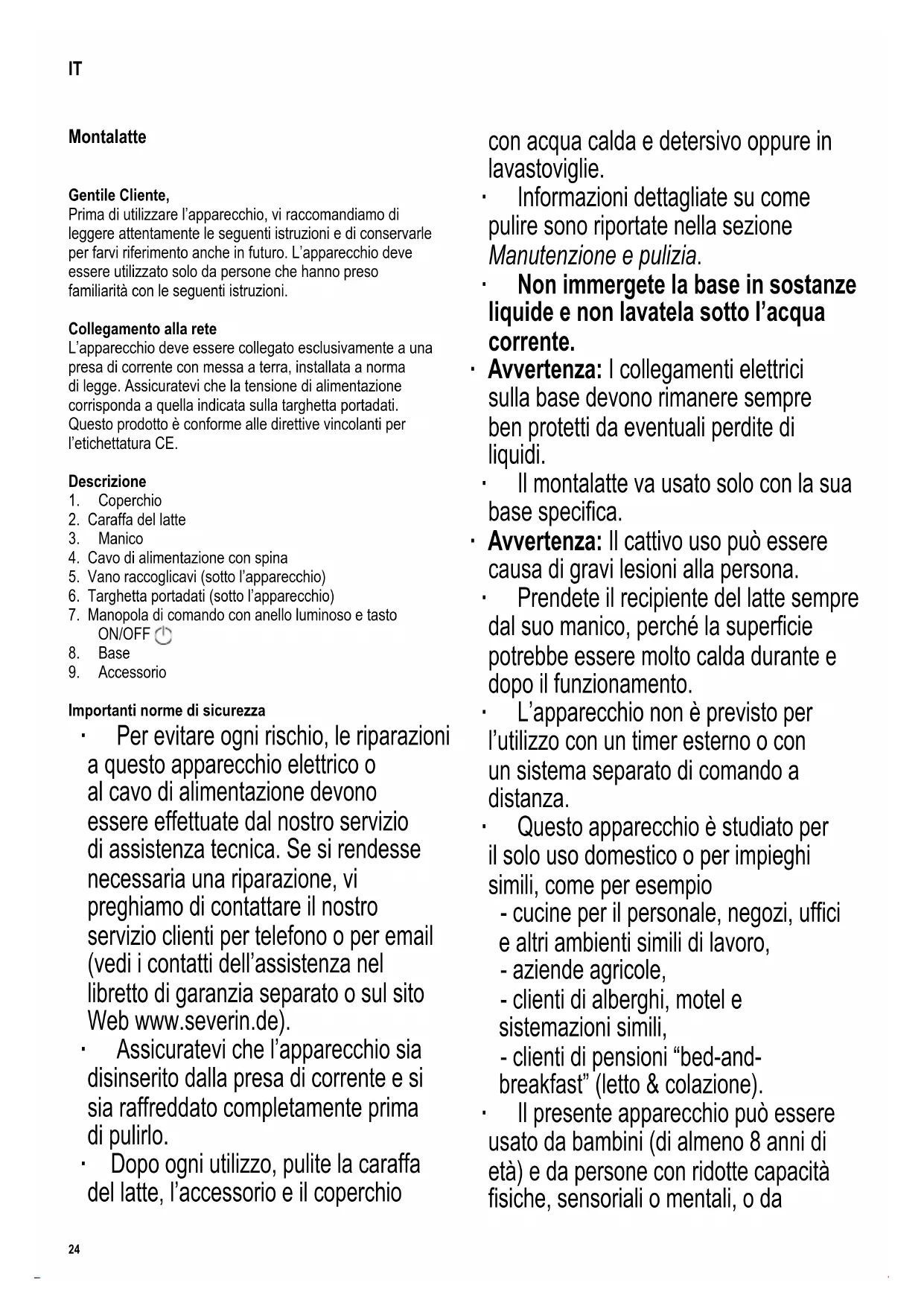 Importanti norme di sicurezza ∙ Per evitare ogni rischio, le riparazioni a questo apparecchio elettrico o al cavo di alimentazione devono essere effettuate dal nostro servizio di assistenza tecnica. Se si rendesse necessaria una riparazione, vi preghiamo di contattare il nostro servizio clienti per telefono o per email (vedi i contatti dell’assistenza nel libretto di garanzia separato o sul sito Web www.severin.de). ∙ Assicuratevi che l’apparecchio sia disinserito dalla presa di corrente e si sia raffreddato completamente prima di pulirlo. ∙ Dopo ogni utilizzo, pulite la caraffa del latte, l’accessorio e il coperchio con acqua calda e detersivo oppure in lavastoviglie. ∙ Informazioni dettagliate su come pulire sono riportate nella sezione Manutenzione e pulizia. ∙ Non immergete la base in sostanze liquide e non lavatela sotto l’acqua corrente. ∙ Avvertenza: I collegamenti elettrici sulla base devono rimanere sempre ben protetti da eventuali perdite di liquidi. ∙ Il montalatte va usato solo con la sua base specica. ∙ Avvertenza: Il cattivo uso può essere causa di gravi lesioni alla persona. ∙ Prendete il recipiente del latte sempre dal suo manico, perché la supercie potrebbe essere molto calda durante e dopo il funzionamento. ∙ L’apparecchio non è previsto per l’utilizzo con un timer esterno o con un sistema separato di comando a distanza. ∙ Questo apparecchio è studiato per il solo uso domestico o per impieghi simili, come per esempio - cucine per il personale, negozi, ufci e altri ambienti simili di lavoro, - aziende agricole, - clienti di alberghi, motel e sistemazioni simili, - clienti di pensioni “bed-and- breakfast” (letto & colazione). ∙ Il presente apparecchio può essere usato da bambini (di almeno 8 anni di età) e da persone con ridotte capacità siche, sensoriali o mentali, o da IT25 142 x 208 mm persone senza particolari esperienze o conoscenze, purché siano sotto sorveglianza o siano state date loro istruzioni sull’uso dell’apparecchio e comprendano pienamente i rischi e le precauzioni di sicurezza che l’apparecchio comporta. ∙ Ai bambini non deve essere consentito di giocare con l’apparecchio. ∙ Ai bambini non deve essere consentito di effettuare operazioni di pulizia o di manutenzione sull’apparecchio a meno che non siano supervisionati da un adulto e siano comunque più grandi di 8 anni di età. ∙ L’apparecchio e il cavo di alimentazione devono essere tenuti sempre fuori della portata di bambini di età inferiore agli 8 anni. ∙ Avvertenza: Tutto il materiale di imballaggio deve essere tenuto fuori della portata dei bambini a causa del rischio potenziale esistente, per esempio di soffocamento. ∙ Prima di ogni utilizzo dell’apparecchio, controllate attentamente che l’apparecchio e gli accessori inseriti non presentino tracce di deterioramento. Se per esempio fosse caduto battendo su una supercie dura, o se è stata usata una forza eccessiva nel tirare il cavo di alimentazione, l’apparecchio non va più usato: danni anche invisibili ad occhio nudo potrebbero comportare conseguenze negative sulla sicurezza nel funzionamento dell’apparecchio. ∙ Non lasciate incustodito il montalatte quando è in funzione. ∙ Rispettate sempre, ad ogni ciclo, i segni dei livelli di min. e max riportati all’interno del recipiente. ∙ La sporgenza sul fondo del recipiente (segno del livello min.) deve essere coperta di latte. Se non c’è abbastanza latte, l’apparecchio può surriscaldarsi. ∙ Attenzione: Riempire eccessivamente il recipiente può essere pericoloso nel caso il latte montato schizzi fuori. ∙ Non coprite le aperture di ventilazione presenti sul retro. ∙ L’apparecchio può essere messo in funzione solo con gli accessori originali forniti dal produttore. ∙ L’apparecchio deve essere sistemato sempre su una supercie solida e piana. ∙ Non poggiate mai l’apparecchio e il cavo di alimentazione sopra amme libere o superci riscaldanti (es. fornelli a gas o piastre elettriche). ∙ Non lasciate pendere liberamente il cavo di alimentazione; tenete il cavo lontano dagli elementi caldi dell’apparecchio. ∙ Disinserite sempre la spina dalla presa di corrente - in caso di cattivo funzionamento, - dopo l’uso, - prima di pulire l’apparecchio. ∙ Per disinserire la spina dalla presa di corrente, non tirate mai il cavo di alimentazione ma afferrate direttamente la spina. ∙ Non toccate la spina di alimentazione con le mani umide. ∙ Nessuna responsabilità verrà assunta in caso di danni risultanti da un uso errato o dalla non conformità alle istruzioni. Uso previsto ∙ L’apparecchio è destinato a essere utilizzato esclusivamente per riscaldare/schiumare latte, cioccolata calda e cacao. Qualsiasi altro uso è considerato improprio e può causare lesioni gravi e danni al dispositivo. ∙ Non inseritevi all’interno altri liquidi o cibi solidi. Prima di adoperare l’apparecchio per la prima volta ∙ Rimuovete tutti i materiali di imballaggio e gli adesivi promozionali rimasti, e controllate che ci siano tutti i componenti accessori. Non rimuovete la targhetta dei dati! ∙ Al primo utilizzo dell’apparecchio o dopo un lungo periodo di inattività, pulitelo accuratamente nel modo indicato nella sezione Manutenzione e pulizia. Vano raccoglicavi ∙ Sotto l’apparecchio si trova un vano raccoglicavi, nel quale potete avvolgere il cavo in eccedenza. Istruzioni d’uso Coperchio ∙ Il coperchio deve rimanere sempre inserito durante il funzionamento. ∙ Potete rimuovere il coperchio soltanto per inserire la cioccolata. Selettore di controllo Potete selezionare le seguenti funzioni: è cioccolata calda/cacao è schiuma di latte compatta è schiuma di latte cremosa è solo riscaldamento è schiuma fredda26 142 x 208 mm Anello luminoso Rosso È stata selezionata una funzione a riscaldamento. Blu È stata selezionata una funzione senza riscaldamento. Luce ssa Il processo è in esecuzione. Lamp
